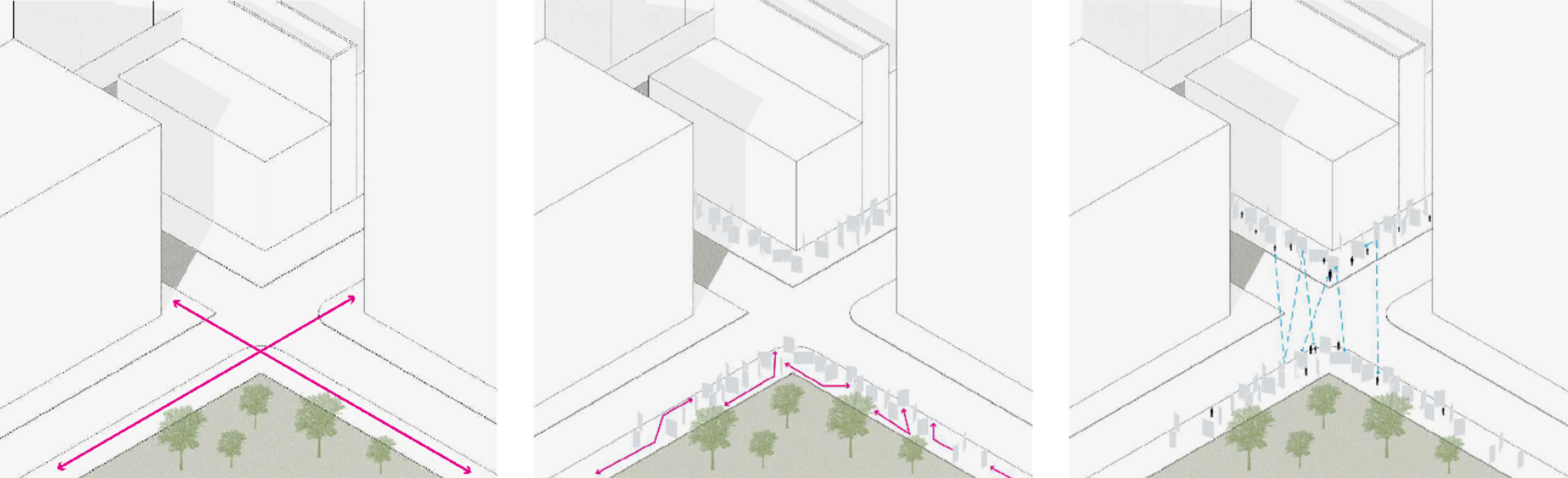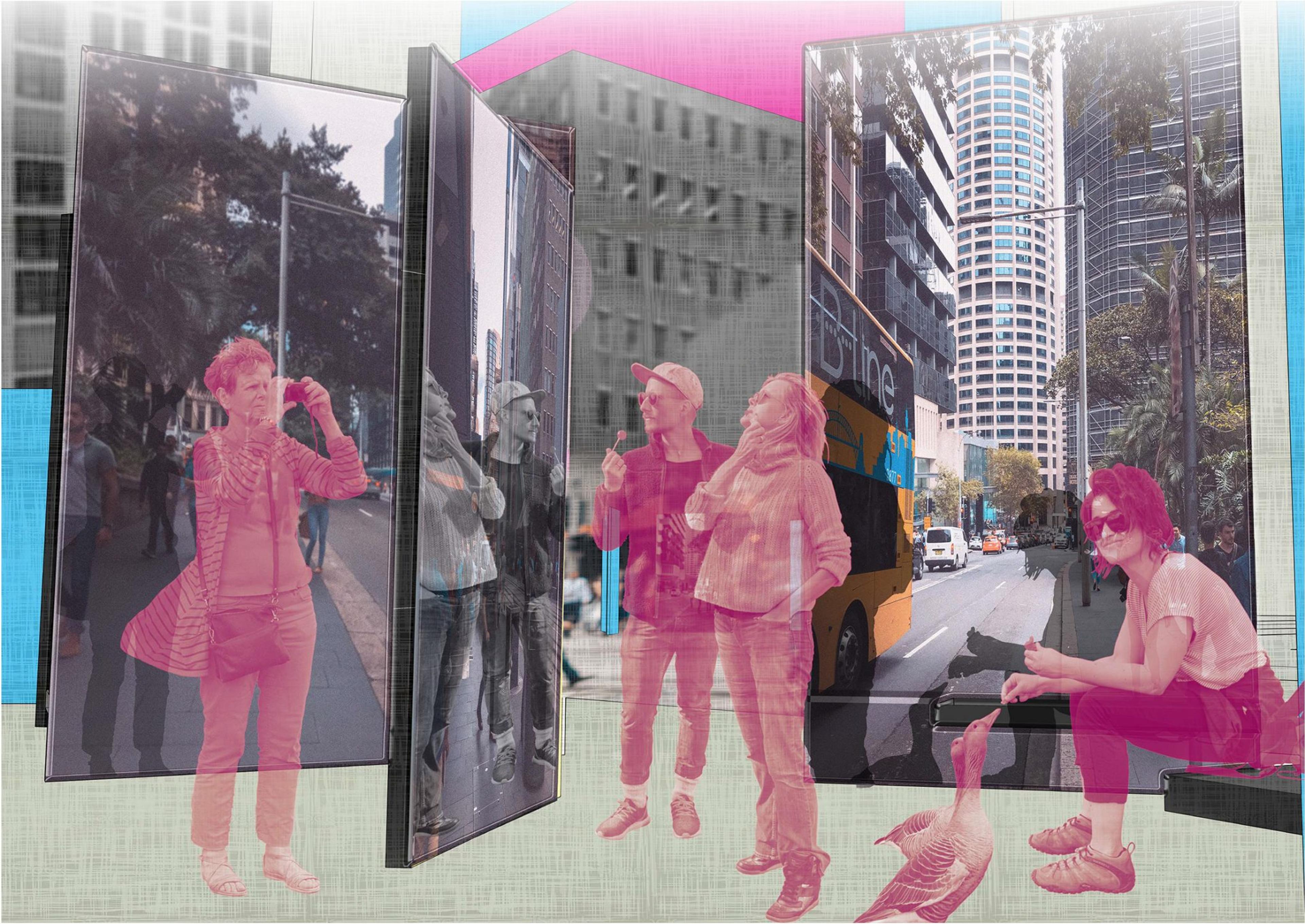 Technology distracts us from the beauty of our immediate surroundings. Our proposal turns the sidewalk into a maze that disrupts continuous flow and utilises mirrors to reflect the news of our immediate surrounding world. Walking on a clear path is an opportunity to get lost inside a screen. Walking through an obstacle course, however, requires focus and cooperation.