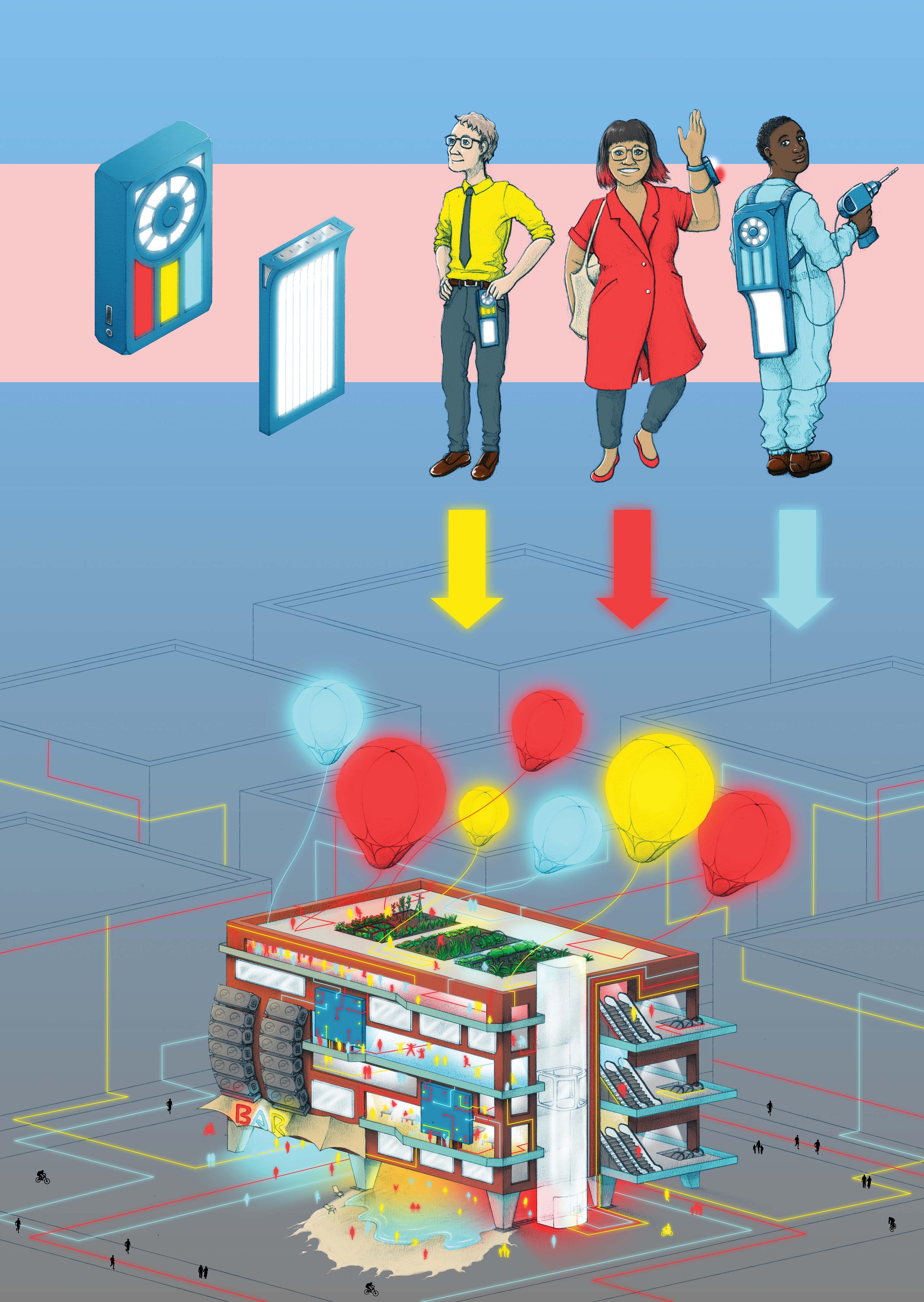 We pictured packs charged with power, which people can ‘spend’ by physically connecting to buildings. You could plug into a local café and supply power for its kitchens to increase food preparation, or into a community garden, adding to the plant growth. A concert venue could amplify sound as more audience members plugged in. A swimming pool could expand to fill more volume as more swimmers arrive and contribute to its power supply. The idea is a power system that encourages communities to work together on a local level, creating places and spaces optimised through inclusion.