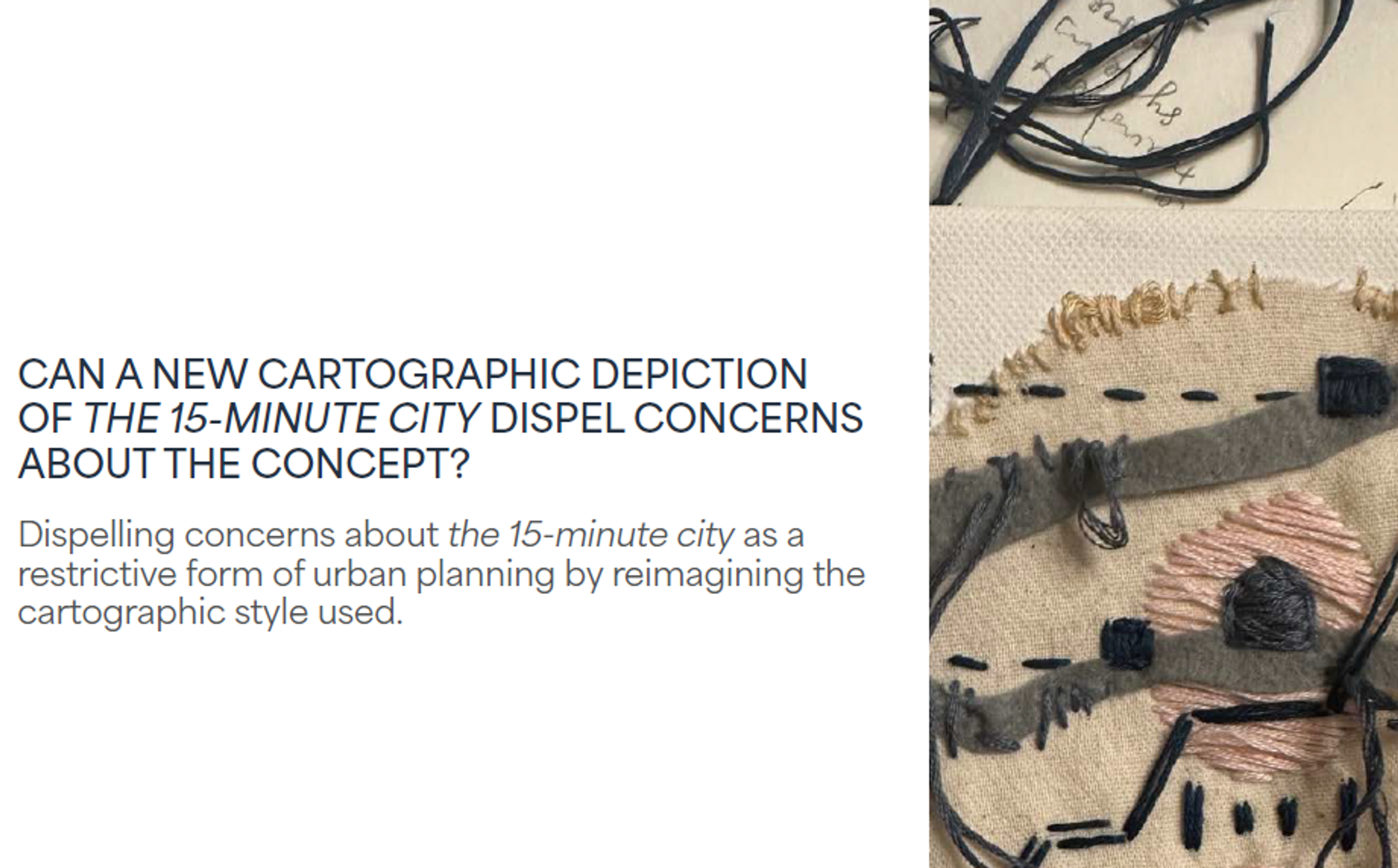 Yasmin’s Ambassadors project sought to dispel emerging concerns around the 15-minute city by conceiving a new cartographic depiction of the concept. Her mixed methodological approach involved ethnographic interviews that asked participants to hand draw maps of their local neighbourhoods – drawings Yasmin went on to weave together into a physical tapestry that blends diverse materials to offer a fresh perspective on the topic, including potential correlations between cartography and agreeability. She complemented this creative output with a research paper that considers academic definitions, historic visualisations and contemporary political interpretations of the 15-minute city.