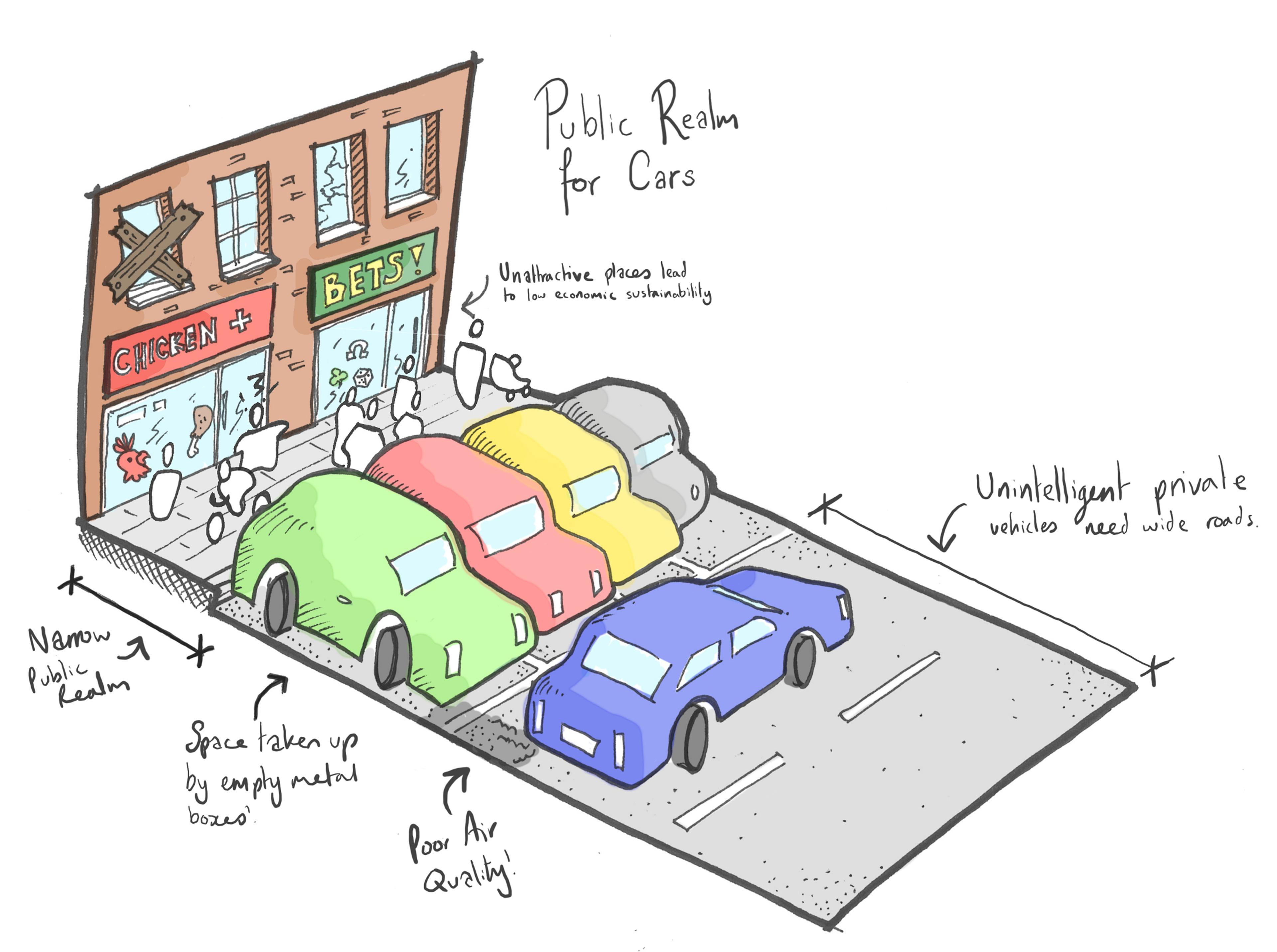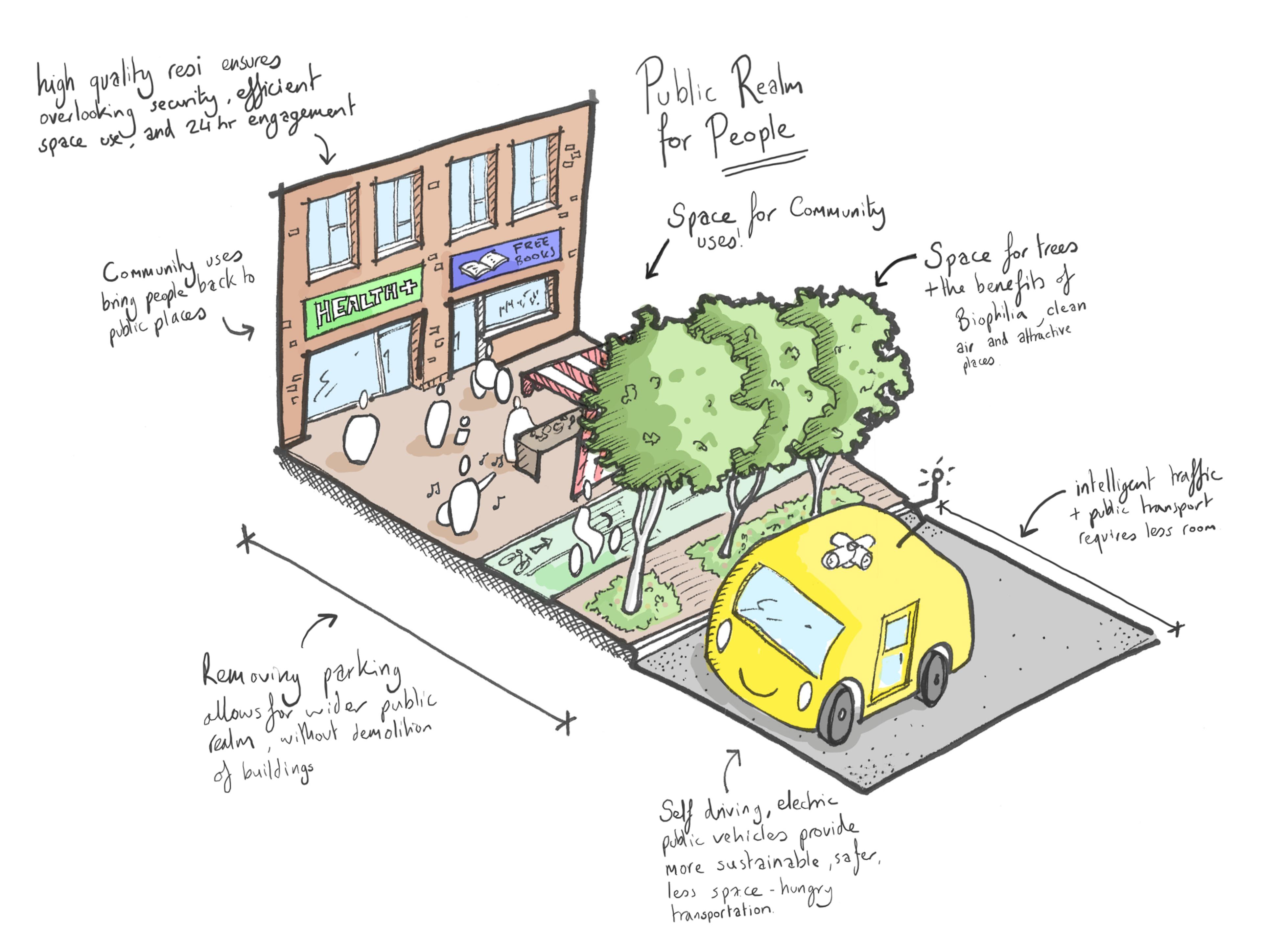 The intervention here seizes upon the global shift away from private car ownership to give the huge amount of car-dedicated space on high streets and in transition spaces back to the inhabitants of the city. Combined with smart public transportation, including self-driving electric vehicles armed with traffic data, this could reduce or eliminate space required for empty private cars parked along streets and reduce road width. In turn sidewalks could be widened to allow for community uses like market stalls and events, segregated cycling paths could be built for sustainable short distance travel, and more trees and greenery could be planted.