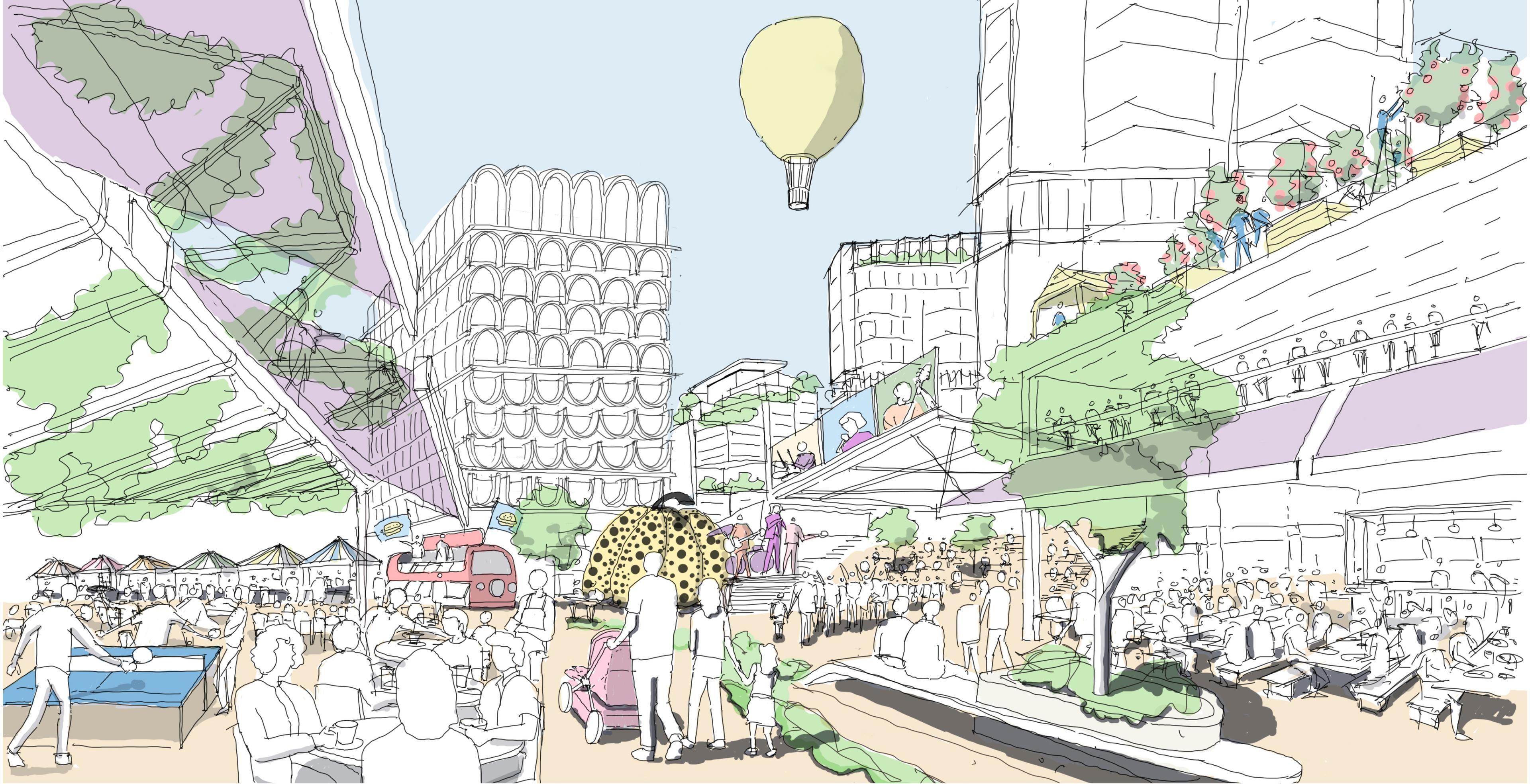 Concept sketch for a vibrant urban development with a mix of uses, including living, working and leisure.