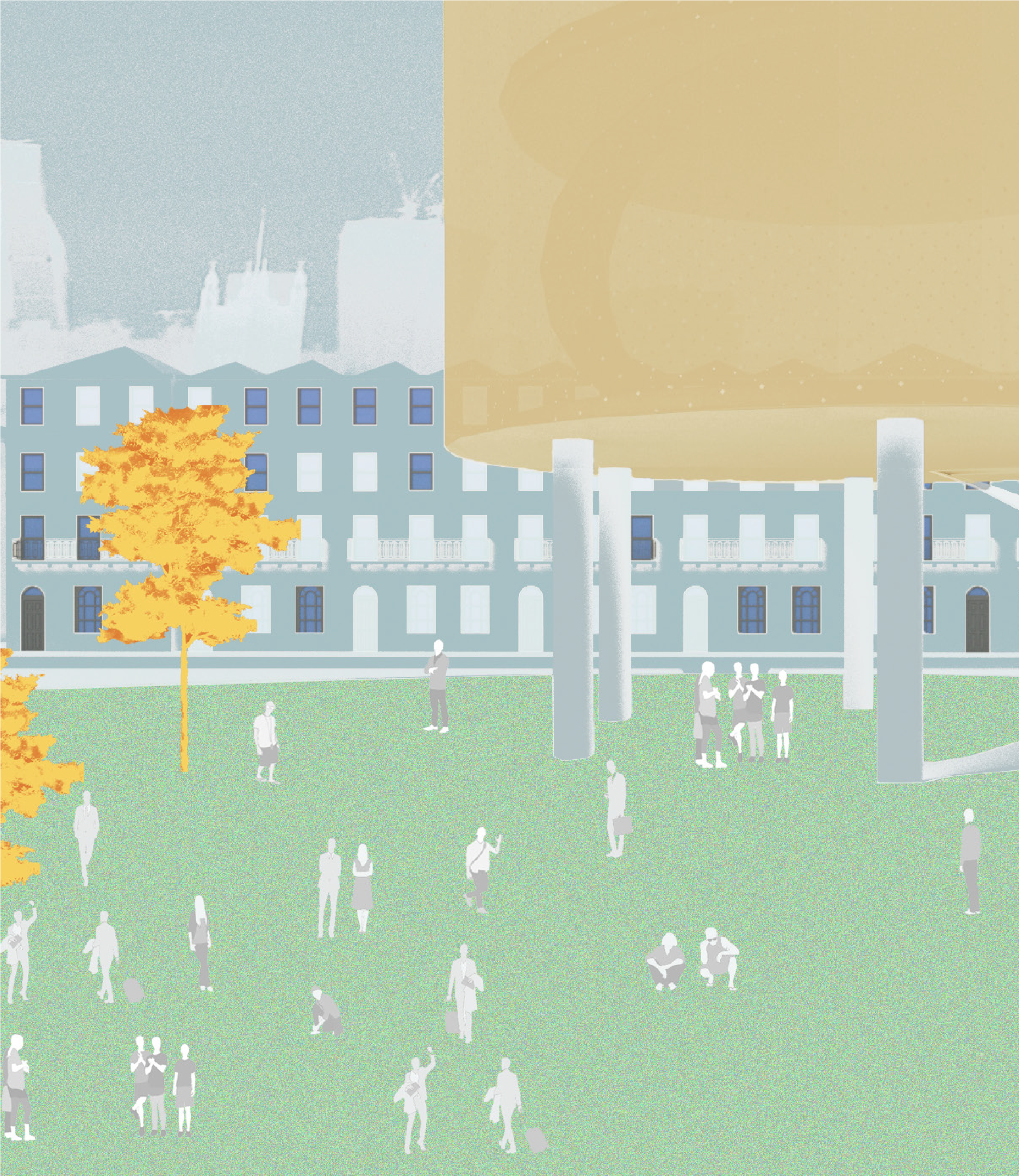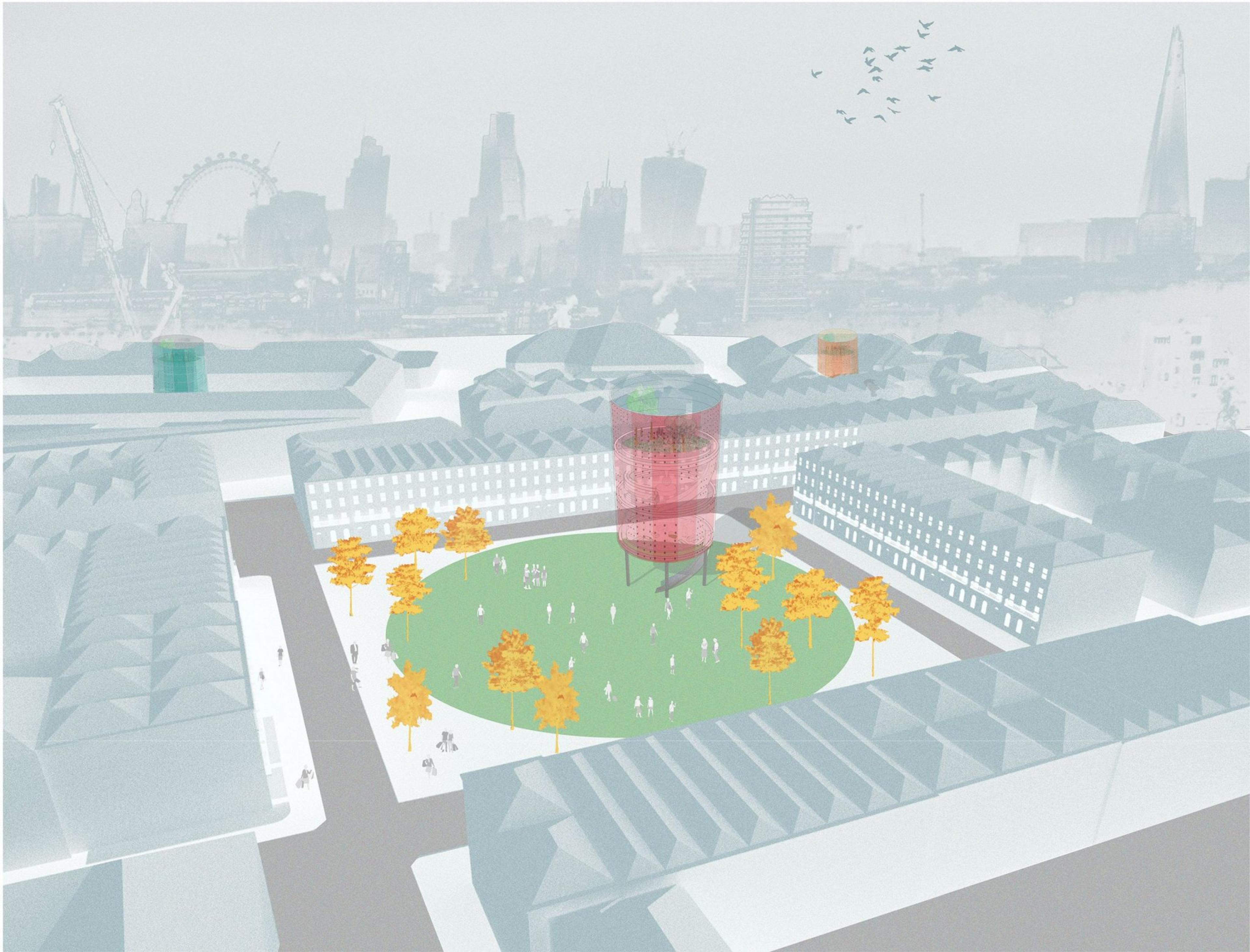 There are four proposed interventions, one for each level of the cylindrical structure: an allotment, an interactive playscape, a social zone and a trading hub.