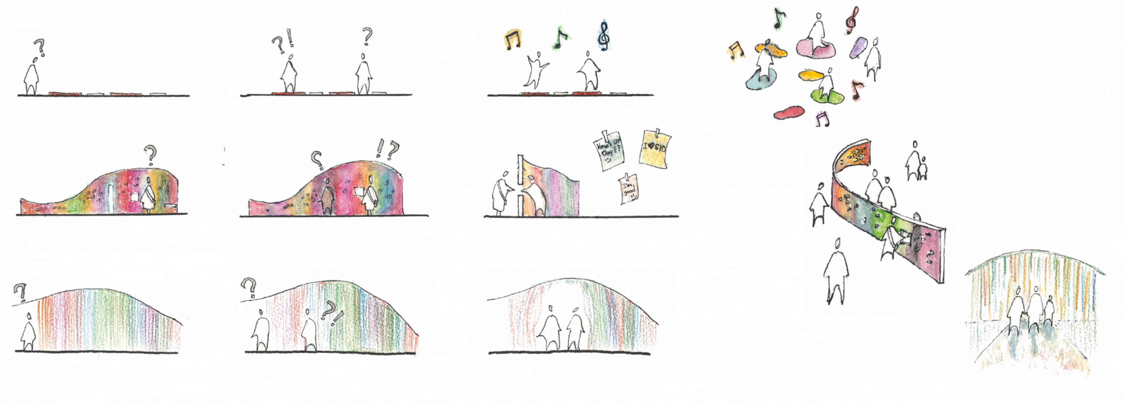 Housed under one sculptural canopy, the activities are centred around sensory experiences: sight, sound and touch. The ‘sound space’ plays instrumental music, activated when multiple people work together. Meanwhile, the ‘sight space’ involves an array of fibre cables, revealed only when two or more participants approach the entry, opening up to show a luminescent array of colours.