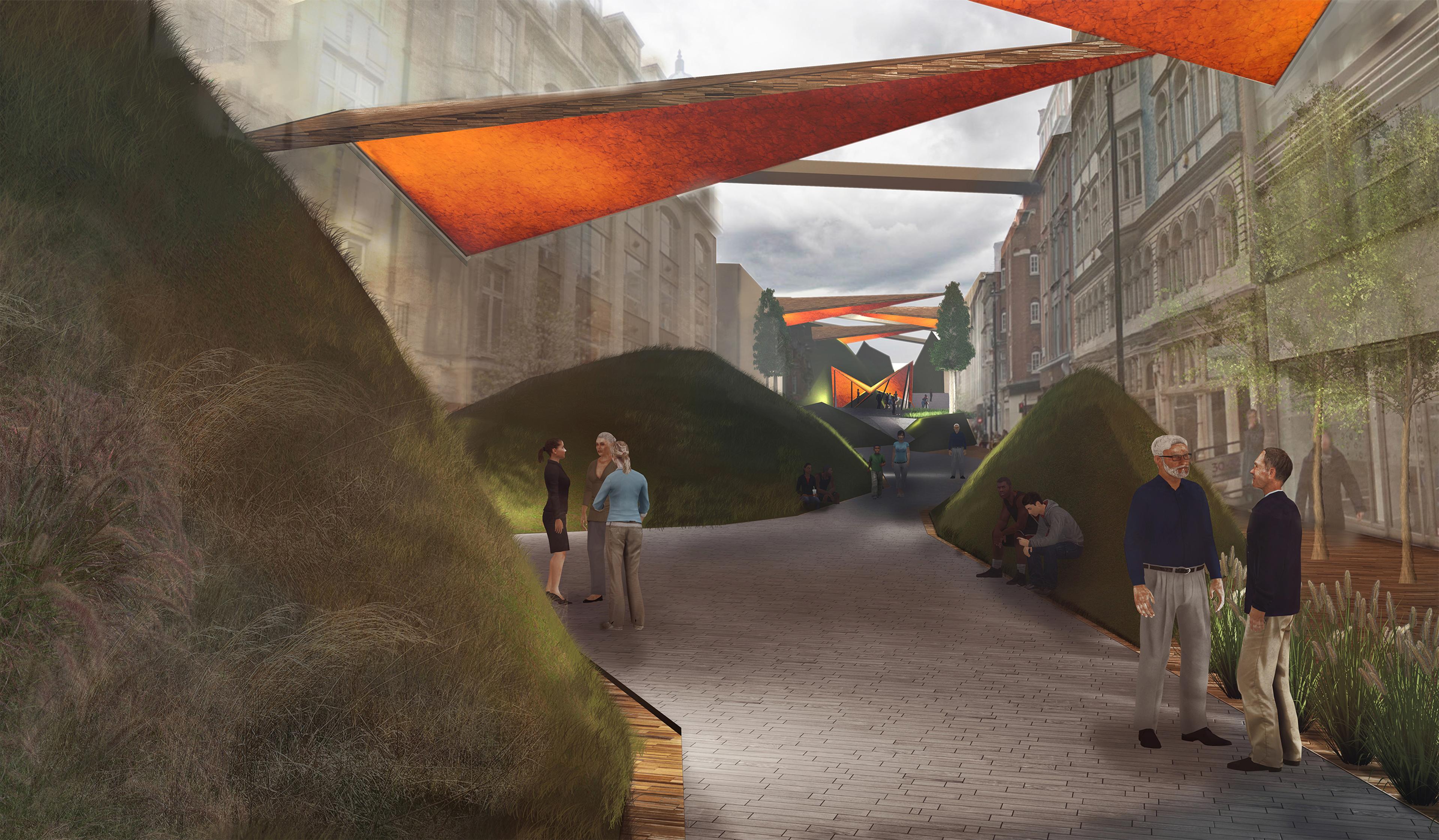 Our new cityscape has an improved topography and use of green space. By utilising extra road space and turning it into green corridors, we have managed to create a peaceful headspace in a bustling city like London. This space is for all – a space for homeless to sleep and connect with others, a place for the elderly to sit and talk, an area for exercise and entertainment, and a space for local farming and organic sharing. All will contribute to a mentally and physically healthier society.