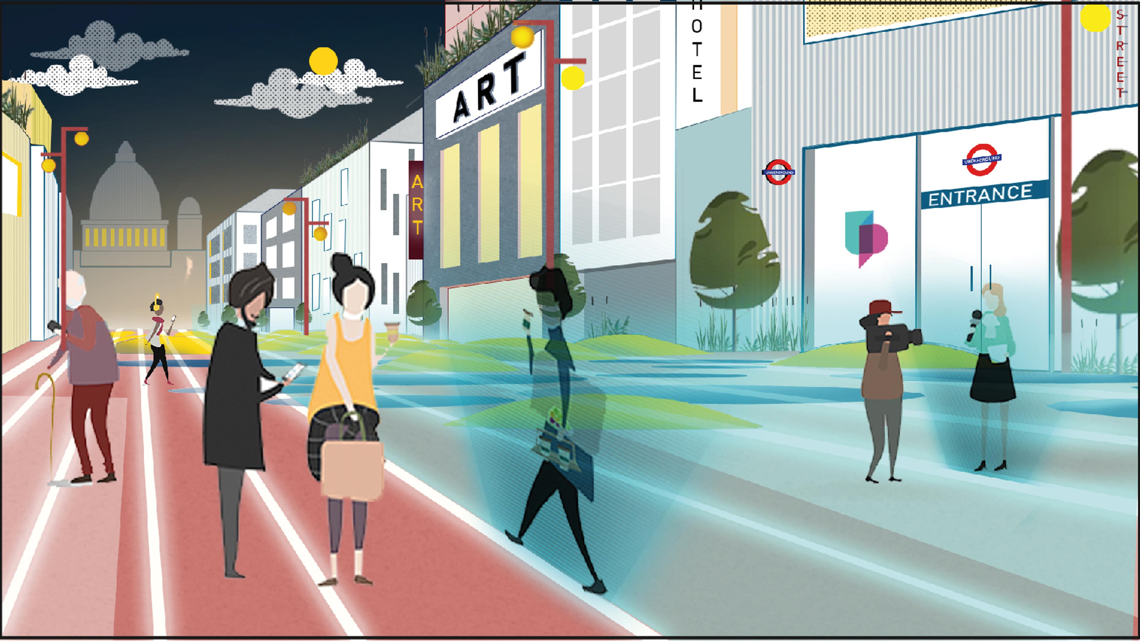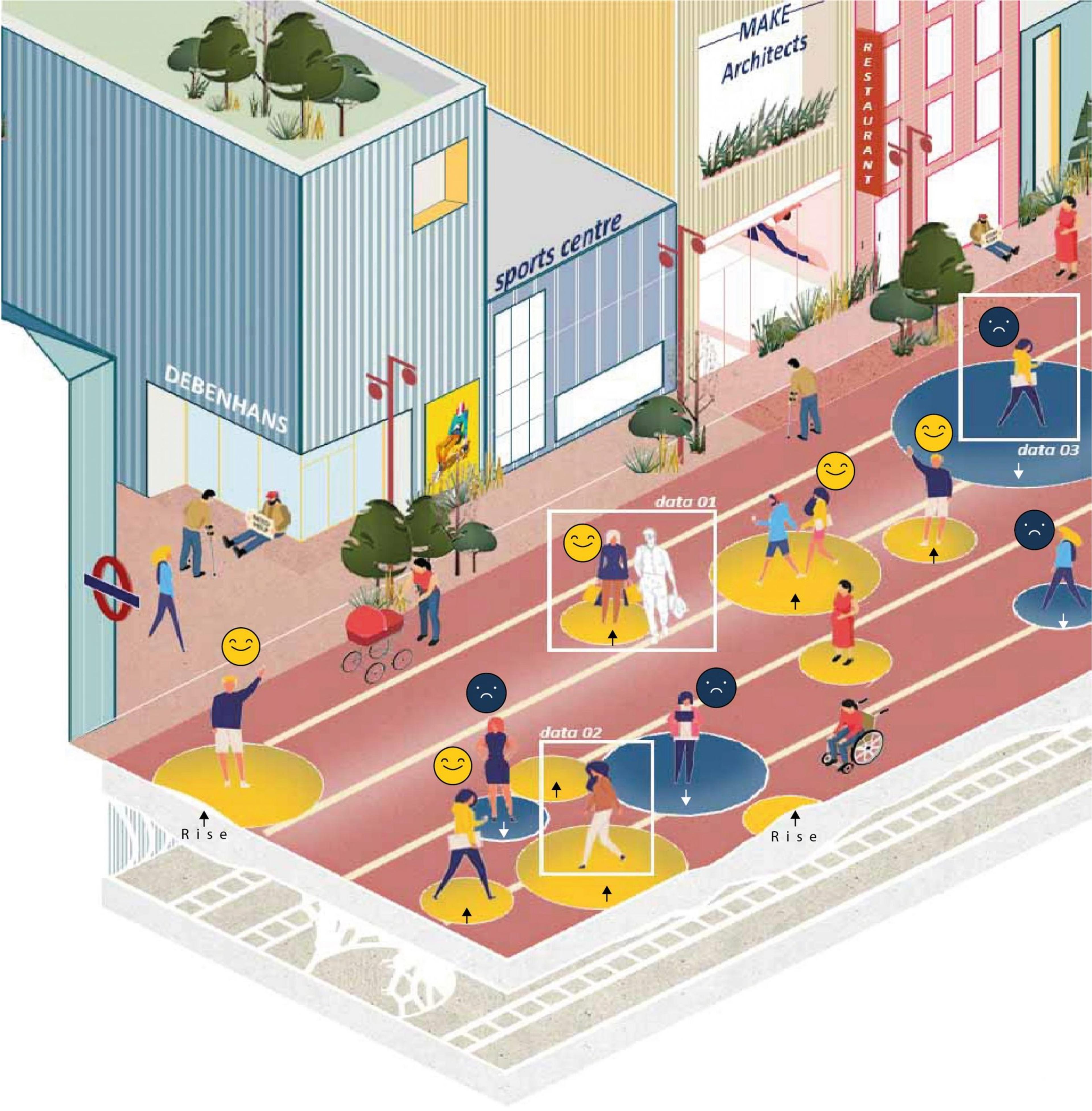 The emotion-sensing street is able to convert the kinetic energy of the public into storable electrical energy for the London Underground. Sensors detect emotion, which then simulates the movement of the ground through artificial intelligence, with segments of the street rising or sinking depending on whether the emotions detected are positive or negative, respectively. When an individual notices another experiencing a negative mood, the ground will sink and they can approach and comfort the person directly.