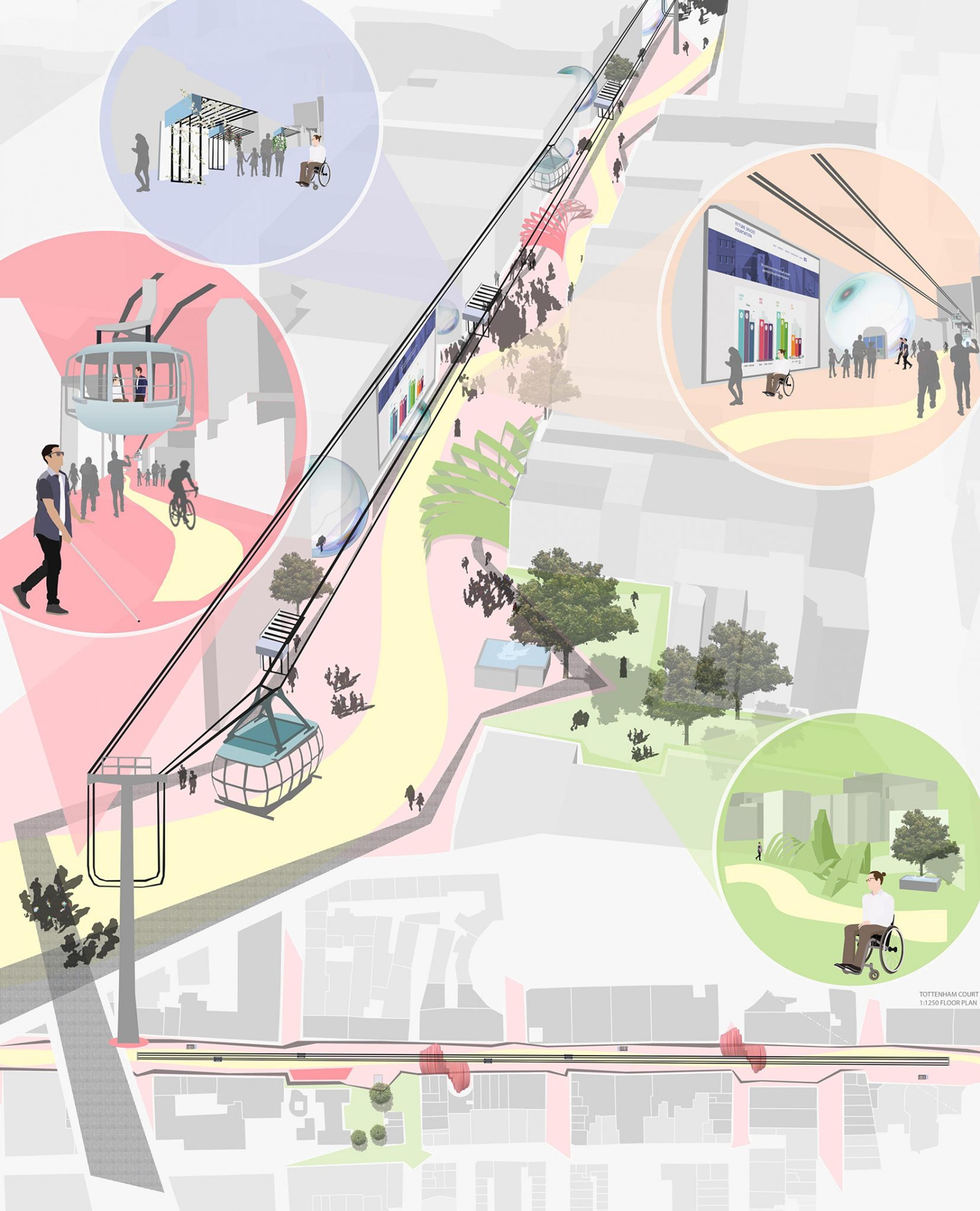 The idea is to blur the social boundaries between able-bodied and disabled members of society. Our design encourages people to see disability as a component of inclusive design. Our proposal is based on London’s Tottenham Court Road but could be replicated anywhere across the city.