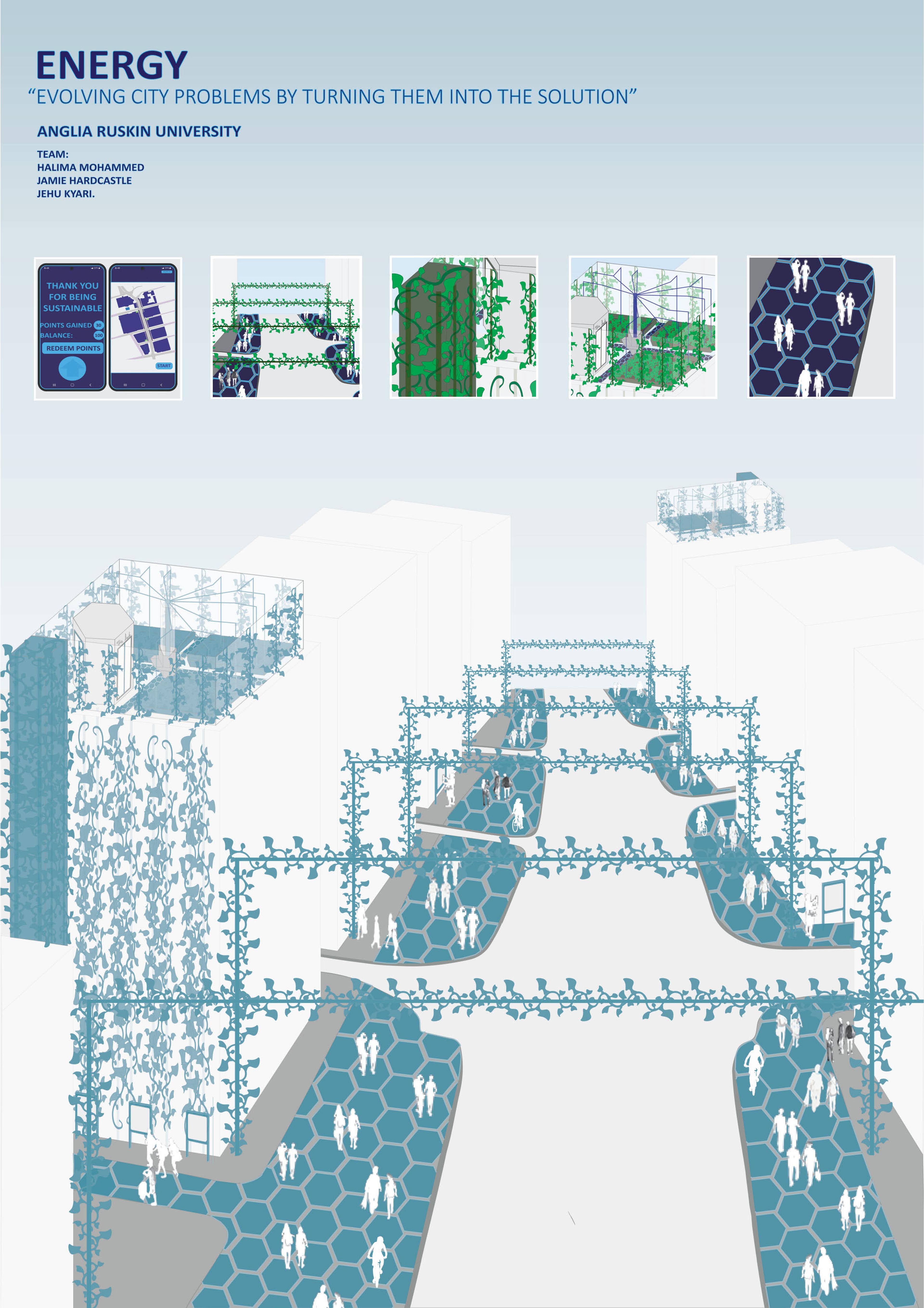Our design brings nature into the city while also tackling the problem of energy within urbanisation. Oxford Street is the starting point for a solution that can be introduced globally. We envision a Green Walk that includes beautiful Vine Valleys hanging between buildings, spanning the width of the roads, with species specially chosen to clean polluted air, enhance biodiversity and promote wellbeing.