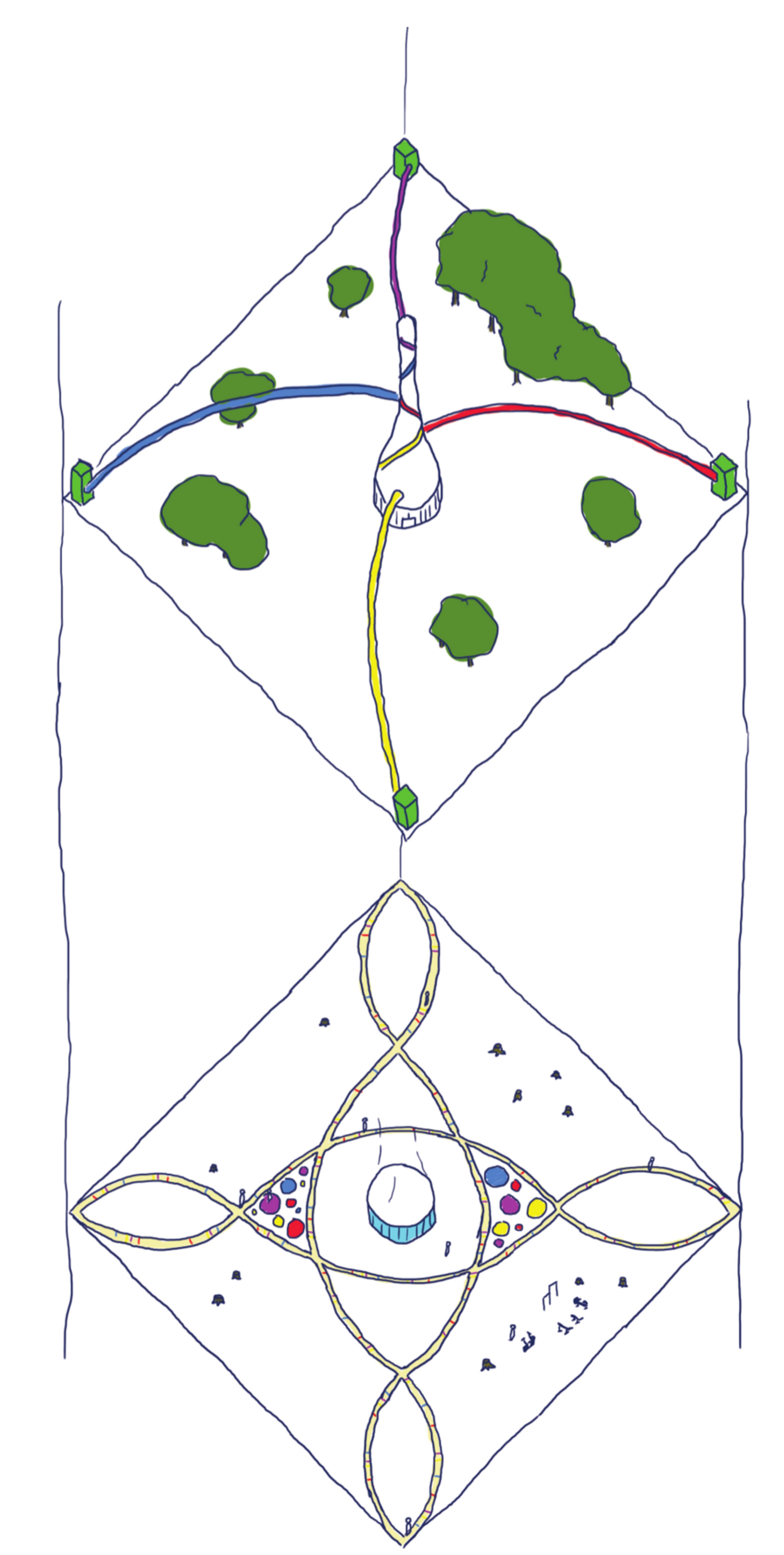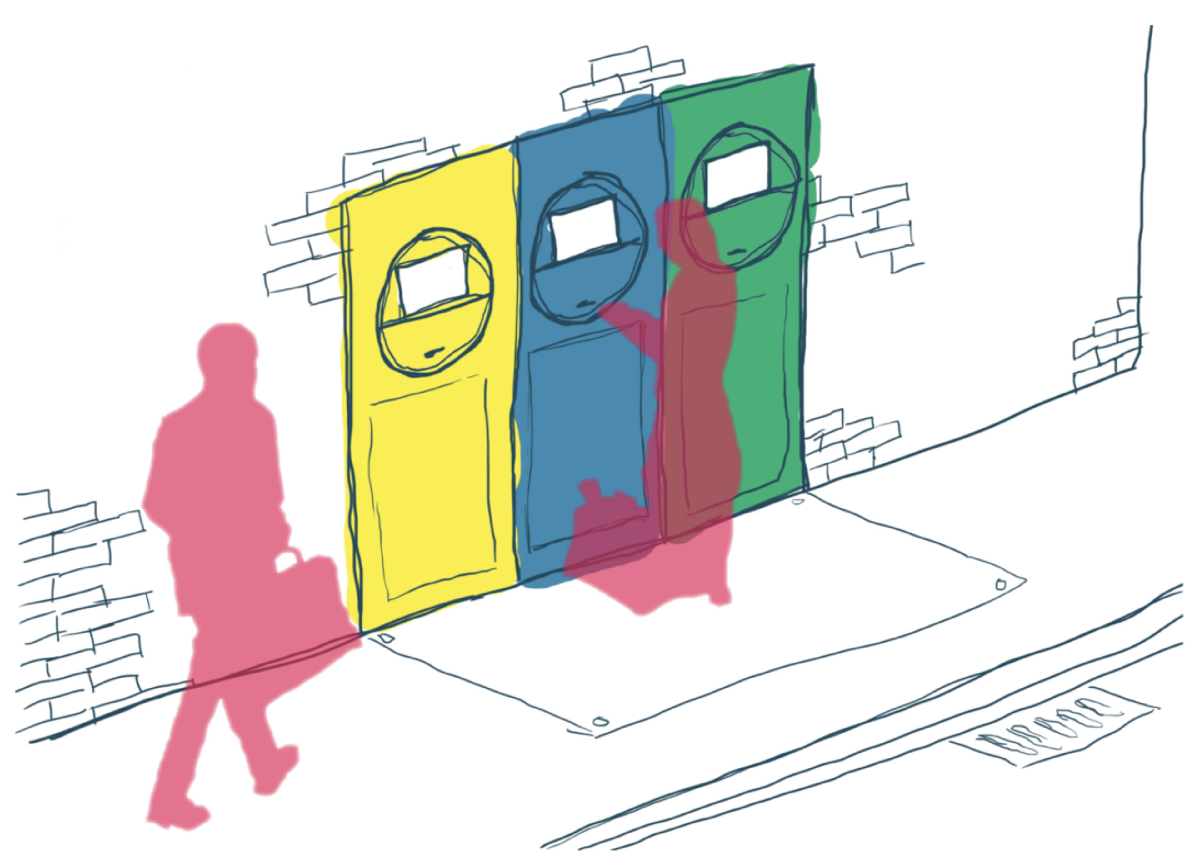 Our proposal envisions a system of recycling plants across London that utilise the spaces parks use to create areas where people can transition to and from their daily business. The system encourages recycling, and generates kinetic and electrical energy from walking and activities. In return, this energy is harnessed to power a community project that radiates positive psychological and societal energies for the people involved in it. Enjoying such transitional spaces contributes to wellness and the quality of work done.