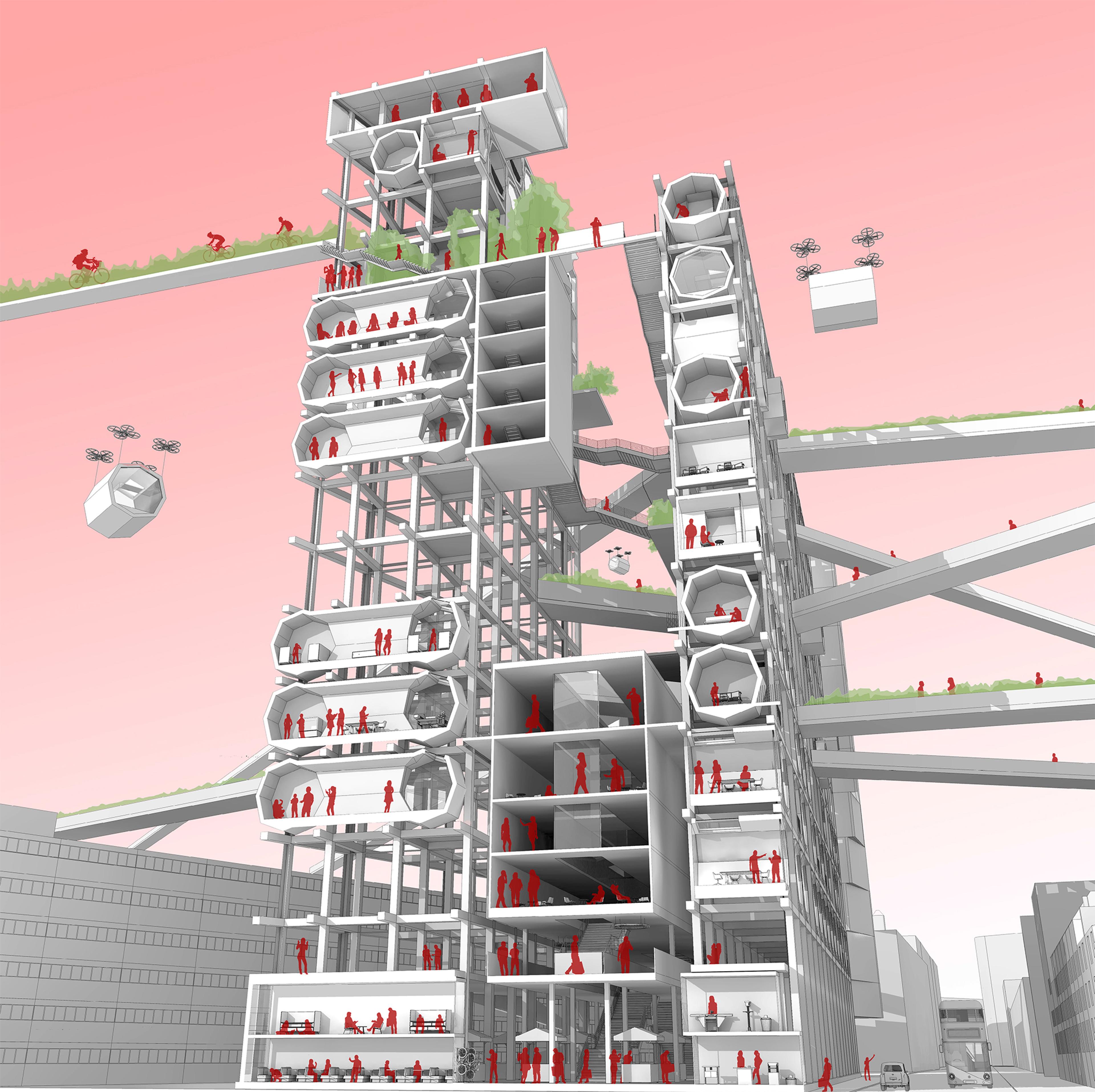We propose a high-density building strategy that makes use of vacant spaces within the city while reusing and repurposing existing buildings. The scheme can be broken down into three constituent parts: The Hive, Satellite Exchange Pavilions and Landscaped Routes.