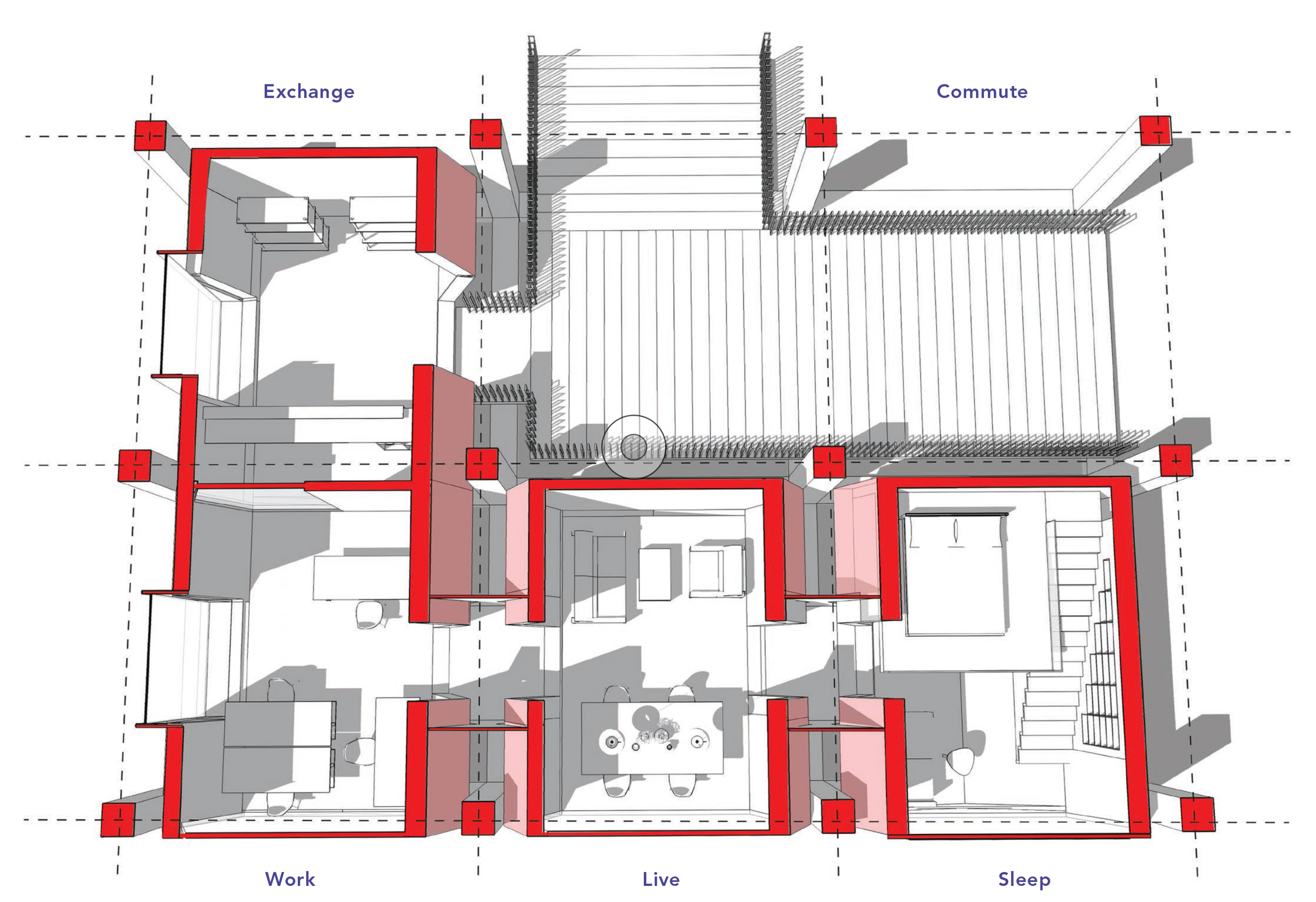 The Hive is based on a modular structural frame that can be inhabited and extended over time as the city densifies. Hives are large landmark interventions at the core of communities that provide event spaces, workshops and accommodation based on the co-living concept.