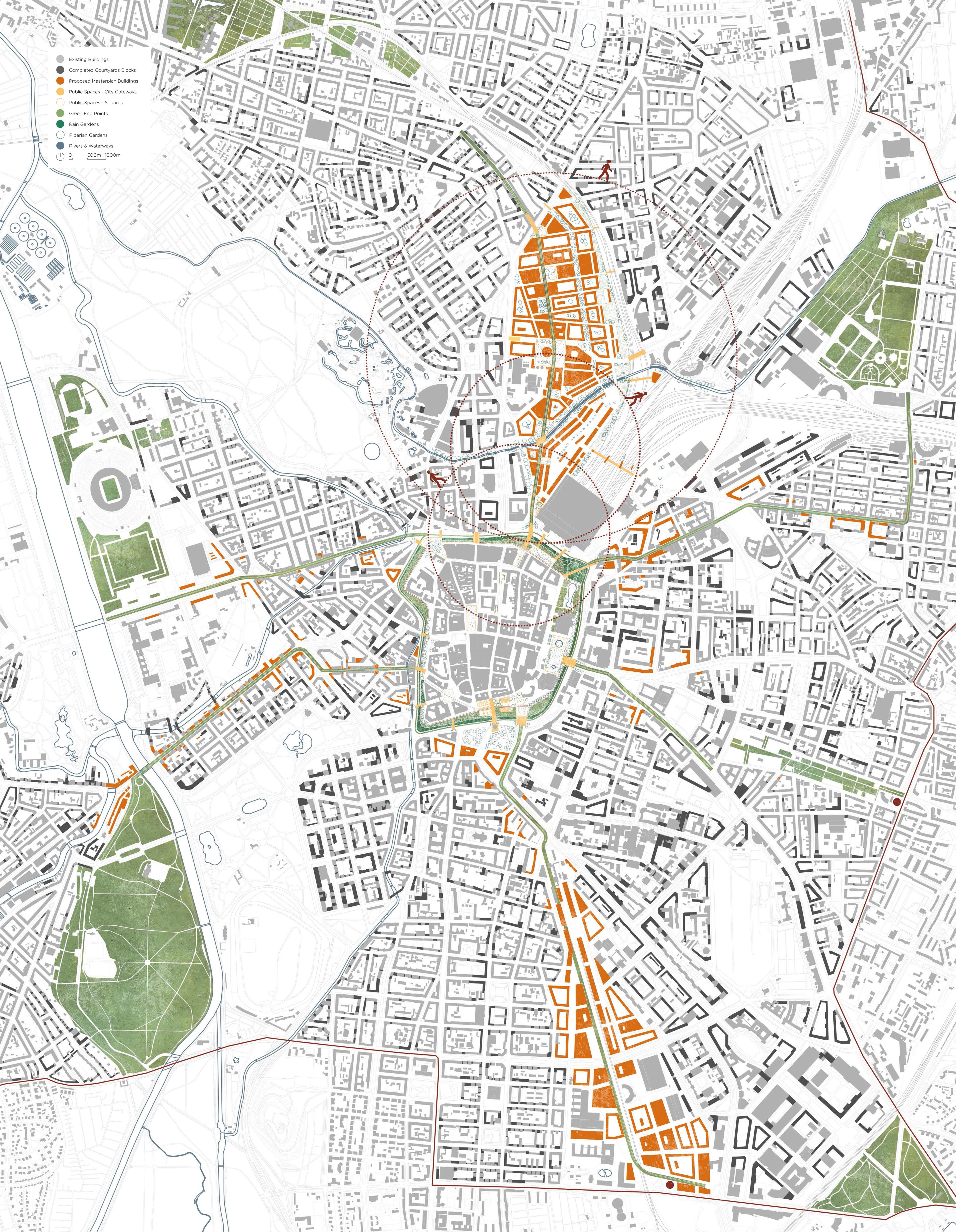 The reinvigorated ring road becomes a pedestrian-focused space, with stitching strands originating from it and becoming new green links that contain the distributed items on the ‘shopping list’. These strands are activated by footfall and cyclists, and feature an improved tram network originating from periphery park-and-ride schemes.