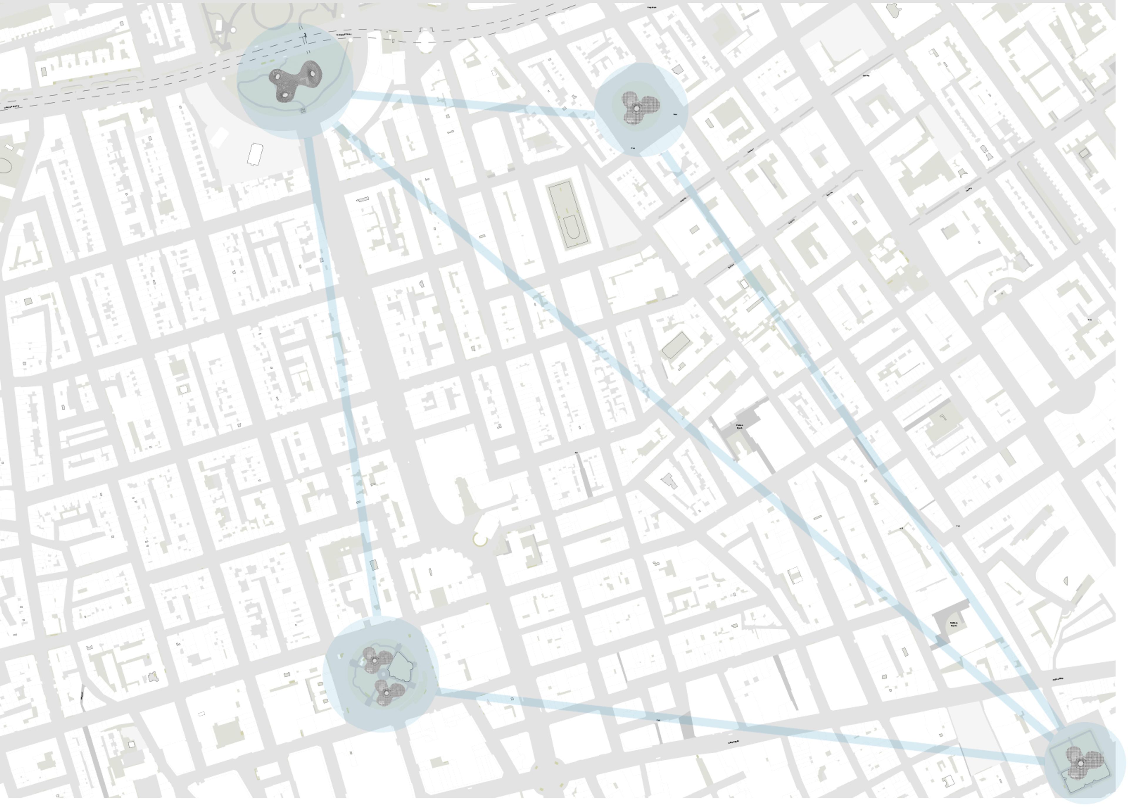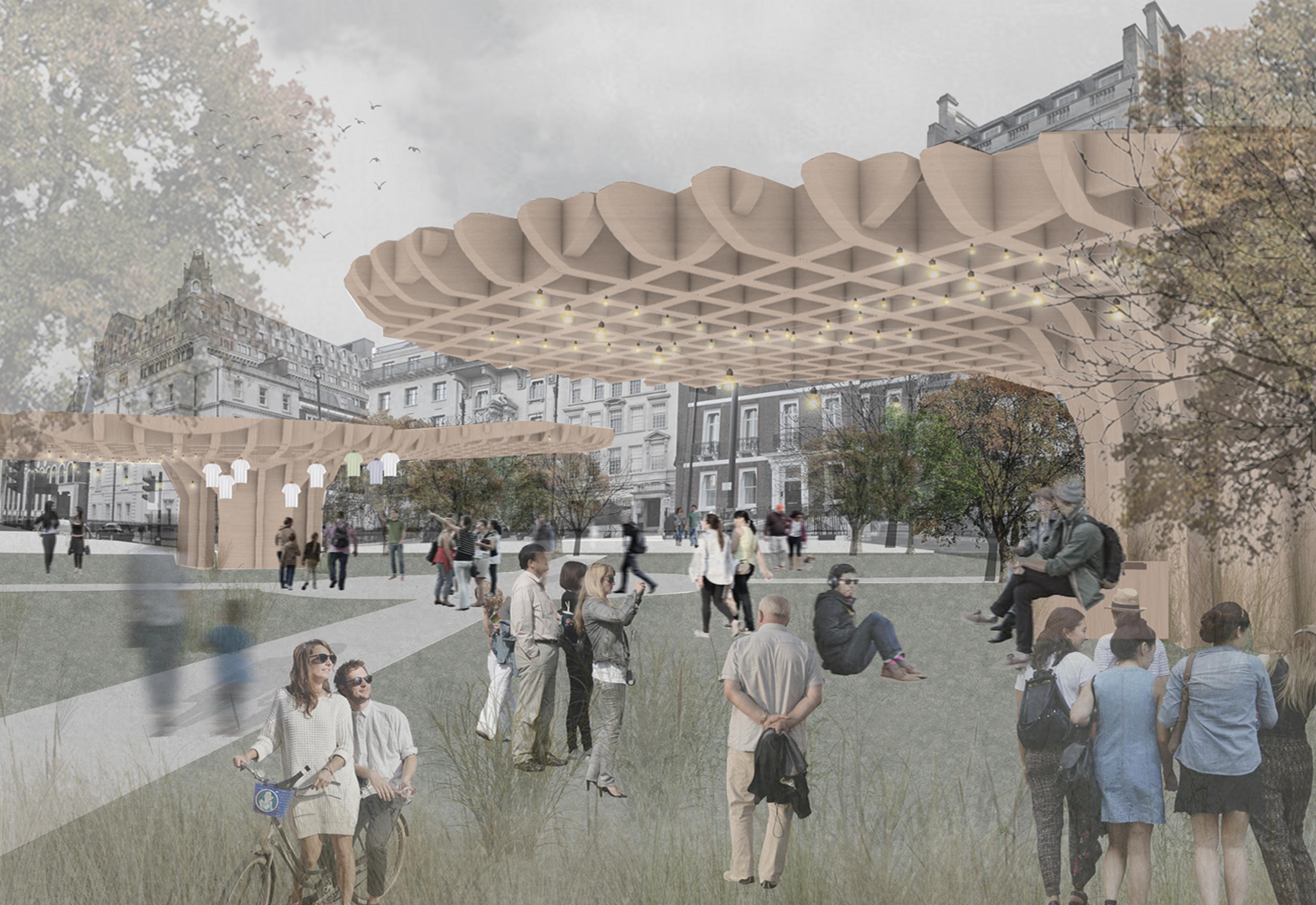 Our proposal seeks to create a social space that is fun and free to experience but also generates money. We have designed hotspots across the city that are marked and connected by footprints on the pavement. Each one is devised to encourage investment from local developers and businesses. Each has its own social media page, and there’s flexibility in use across them – for example, themed markets and spaces that can be used differently during day and night.