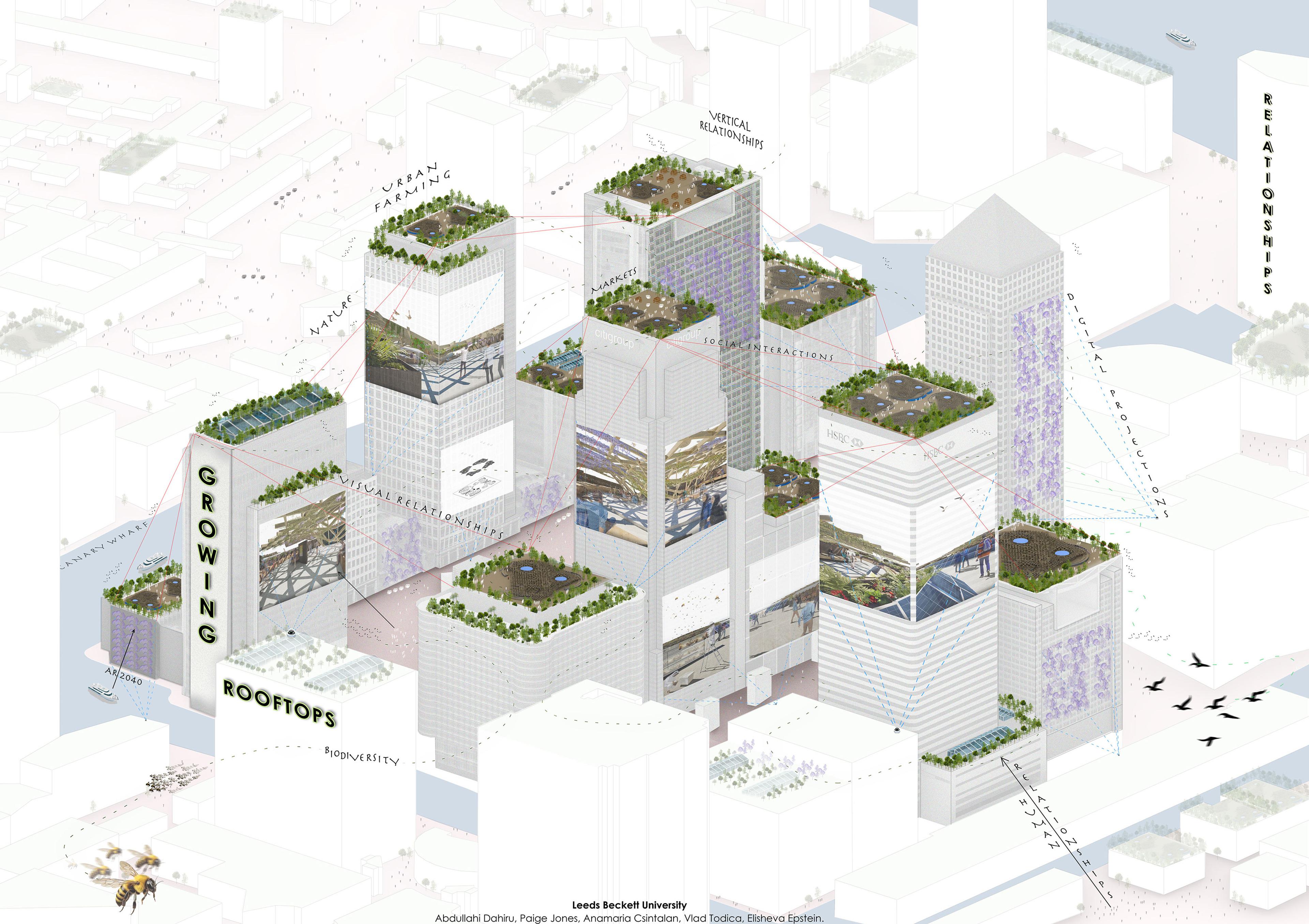 London has the opportunity for creative, adaptive reuse of existing spaces to support the formation of habitats and redistribution of local native species. The masterplan uses technological advances and mixed reality to convey the newly formed growing rooftops at ground level through digital façade projection to explore the vertical relationship between ground, high-rise, and humanity. The proposals intention is to redefine the existing fabric into a greener city, promoting built relationships between human, bio-life and high-rise architecture.