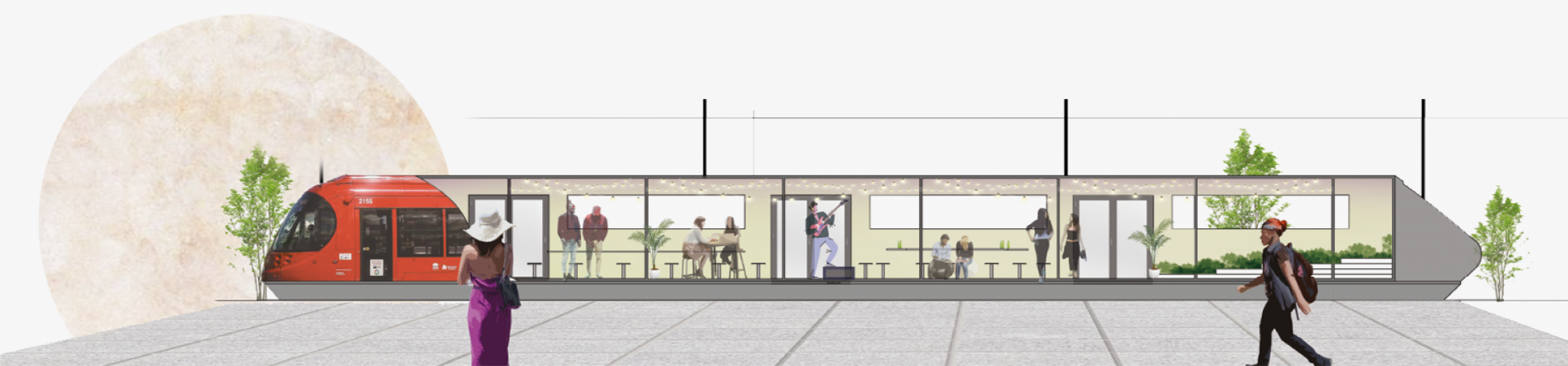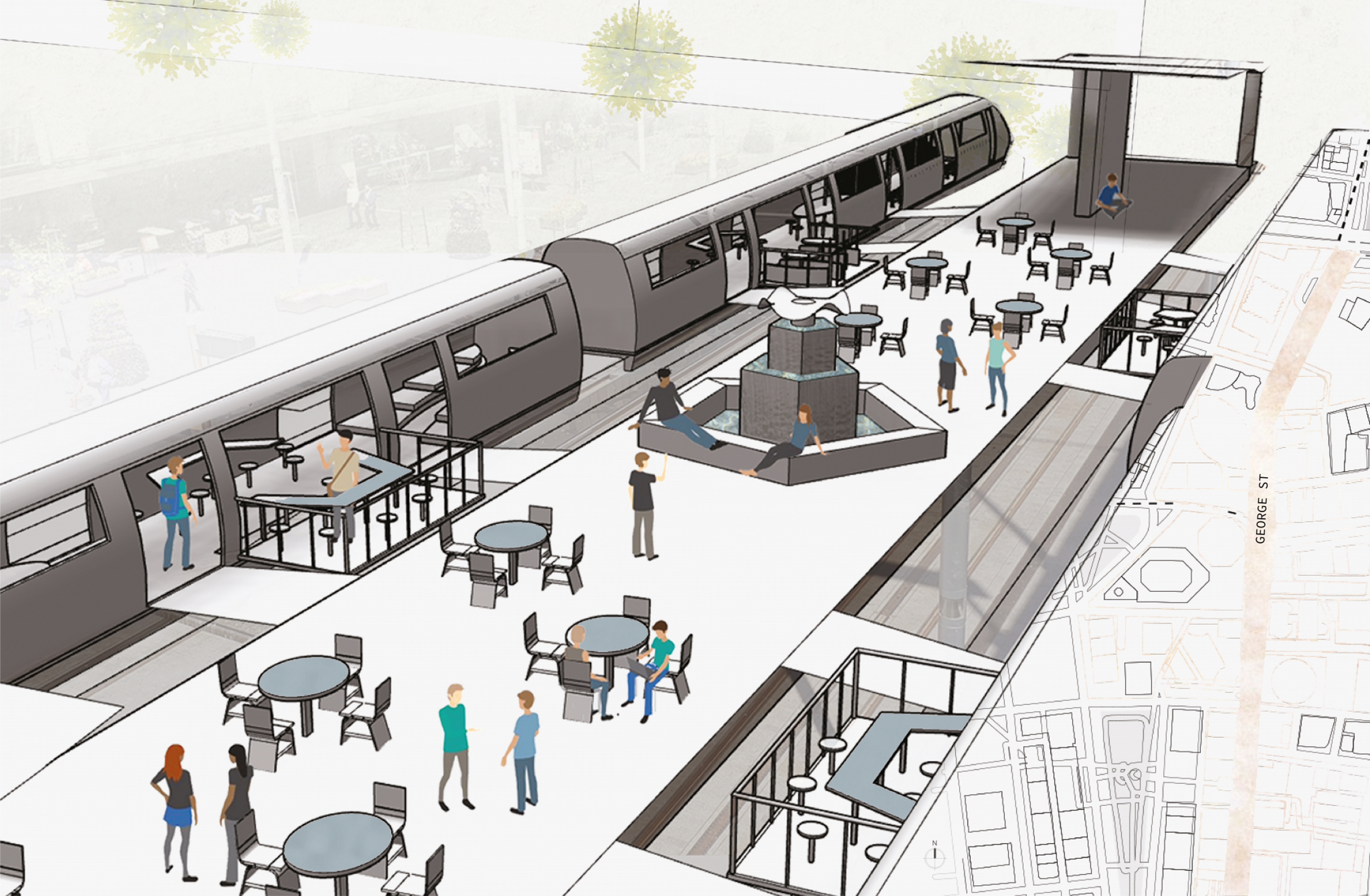 The network we envision is progressive, fluent, interactive, personal and social. We’ve selected George Street as our site, and propose taking advantage of the area’s existing light rail infrastructure to create new mixed-use transit experiences that facilitate interaction between users – for example, cafés within train carriages and co-working spaces across platforms. This fusion of transport and architecture will provide unexpected communal spaces across the city commute.