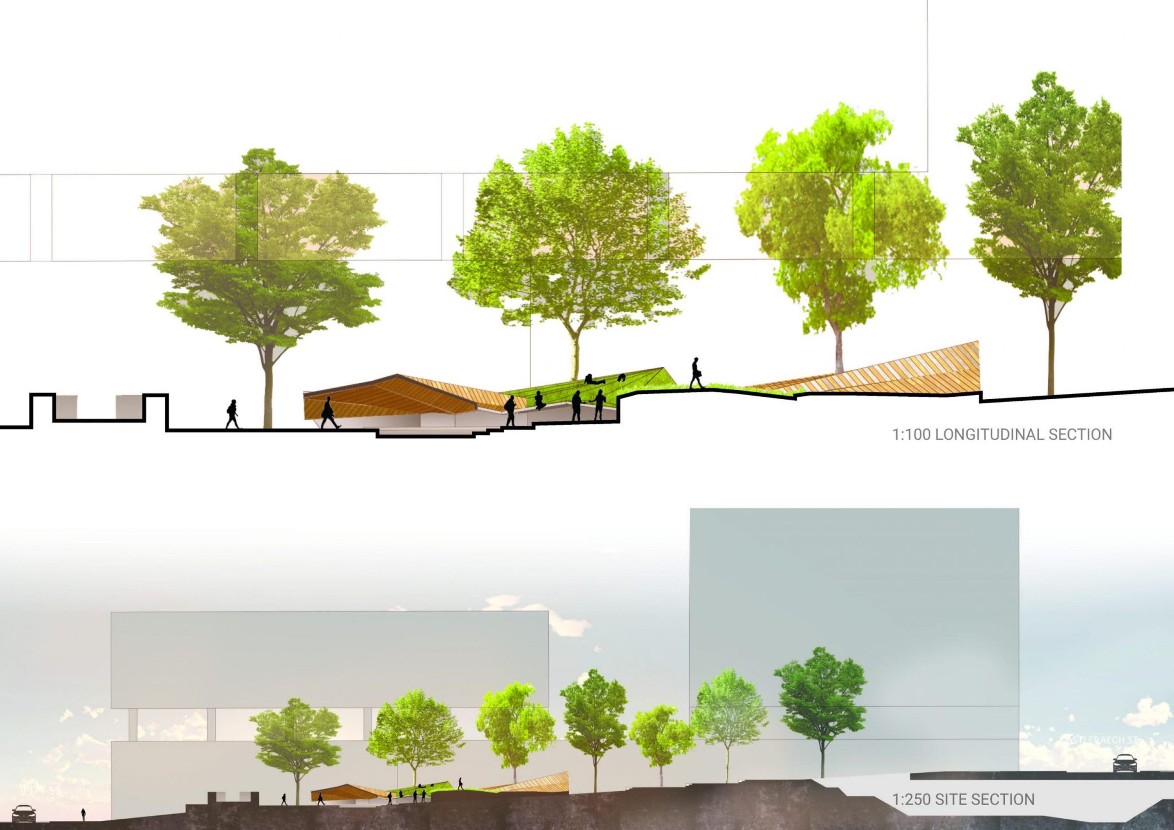 Special sensors attached to the speakers register how many people hang around when a specific comment is played. They preserve those that attract the largest audience and recycle the rest into ambient music played in the green resting space above.