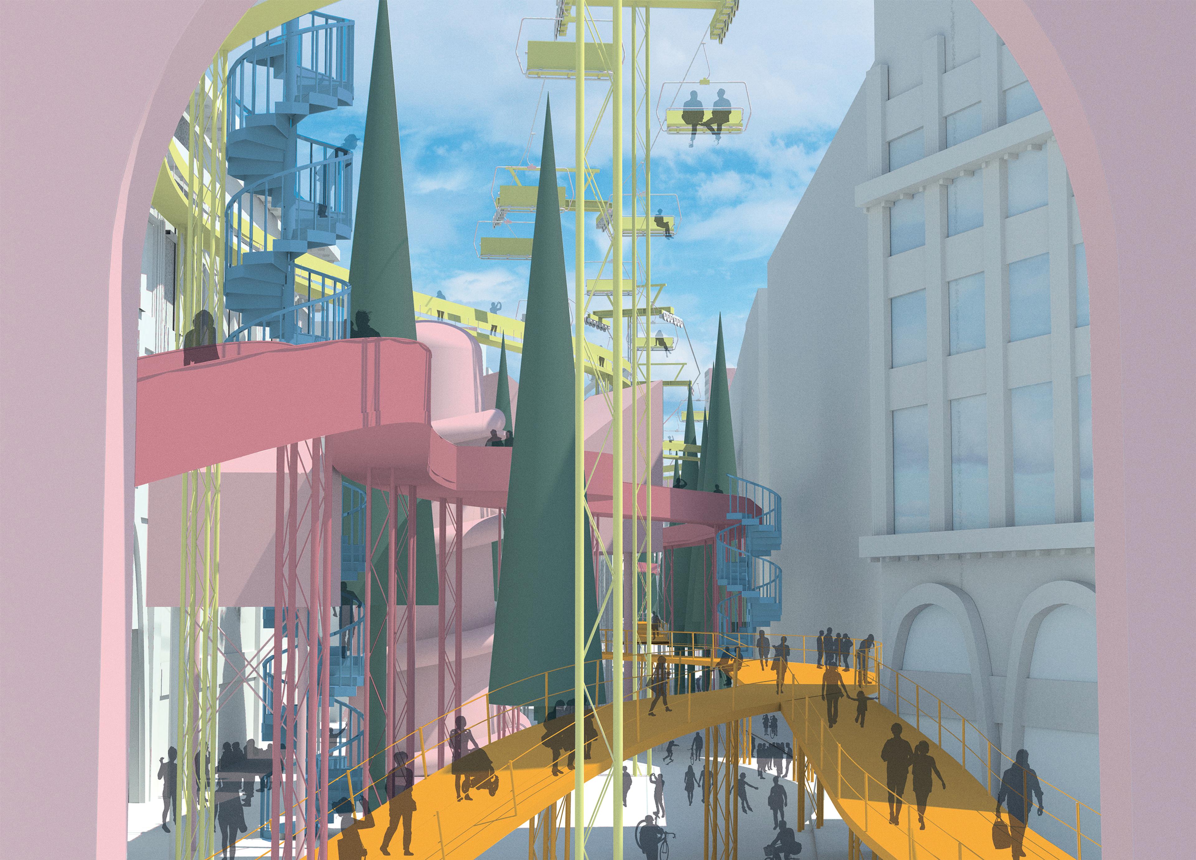 Oxford Street is one of the busiest streets in the world, a perfect opportunity to spread the idea of formless play to as many people as possible. Landscapes reminiscent of children’s drawings, with bold, bright colours, over-scaled architectural follies and simple block treescapes, look to re-educate visitors on what play can mean. The follies and spaces within the project are free to be used for a multitude of activities, be it structured artistic displays or spontaneous visitor-led play. Pathways that bend and swerve and cable cars that rise high above offer an alternative means of travel and an opportunity for slower movement through the site.