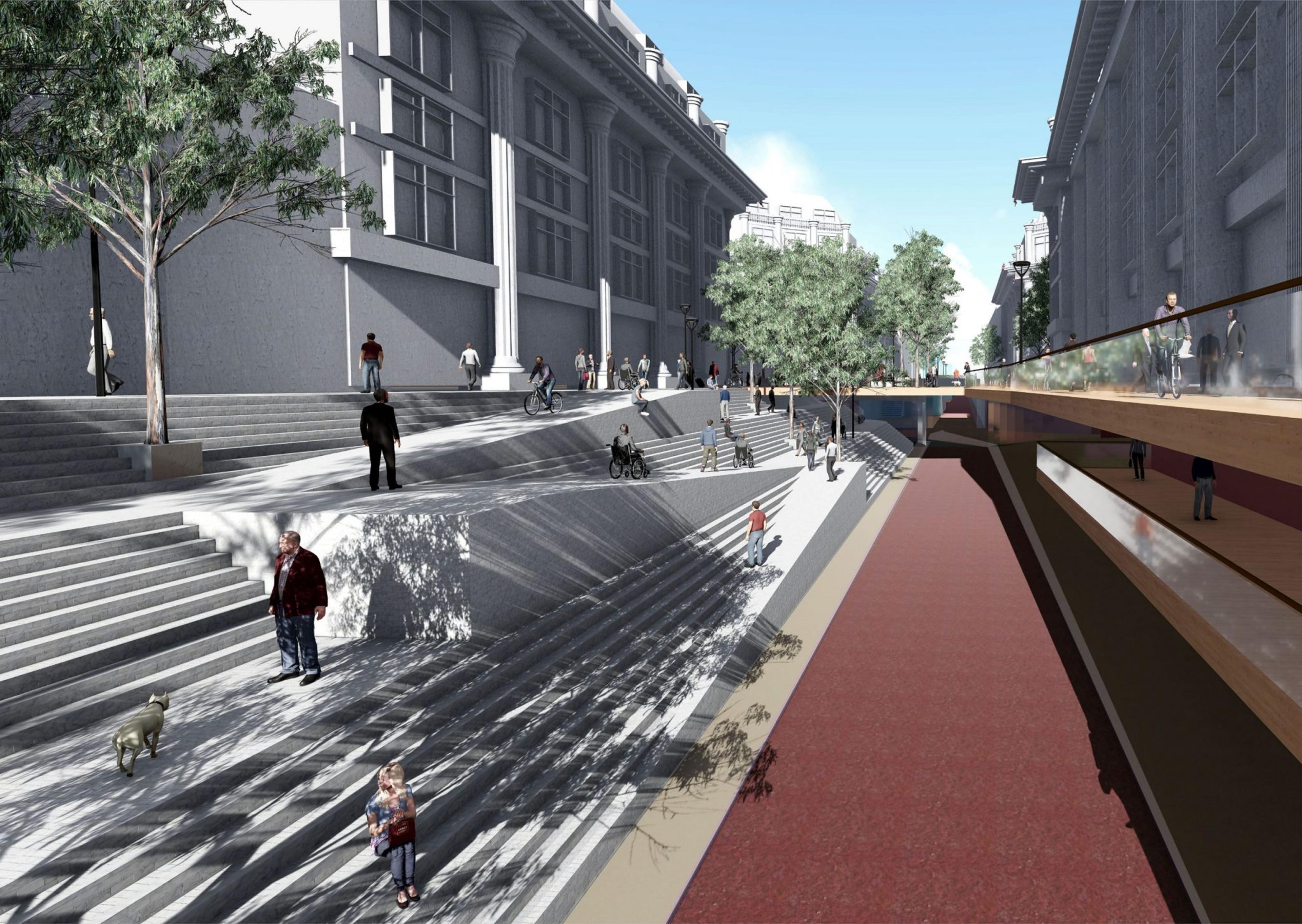 Transport for London and the Mayor of London have introduced plans to pedestrianise Oxford Street, making it a traffic-free zone, but many residents oppose the plans due to transport access issues. Our proposed solution, the Red Zone, addresses this issue by excavating the road to provide a lowered route for buses and taxis and a more fluent transport connection at Oxford Circus Underground Station. This would result in wider pavements, spacious crossover bridges, and a cascade of interconnecting terraced pavements leading down from the existing street level to the new road, forming spaces for engagement and activity below the main shopping streets.