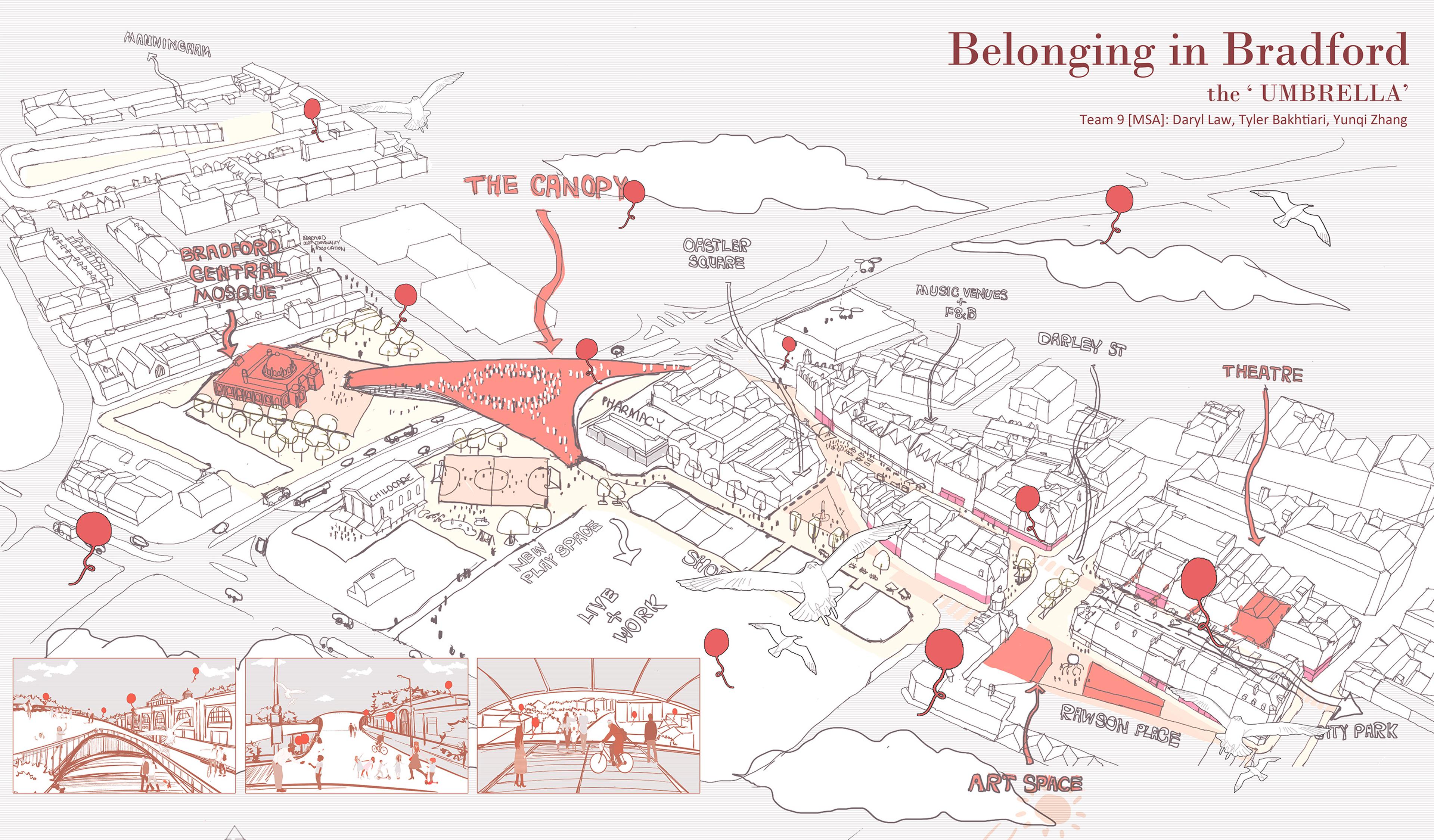 Emerging as a connection between Bradford City Centre’s Central Mosque, and its Creative District, the Umbrella emanates, sheltering, connecting, once estranged communities. Developing a surrounding network, the Umbrella gives itself and the institutions in proximity a means of communication, not just between themselves, but to the broader community of Bradford. It becomes a hub to accelerate opportunity and understanding.