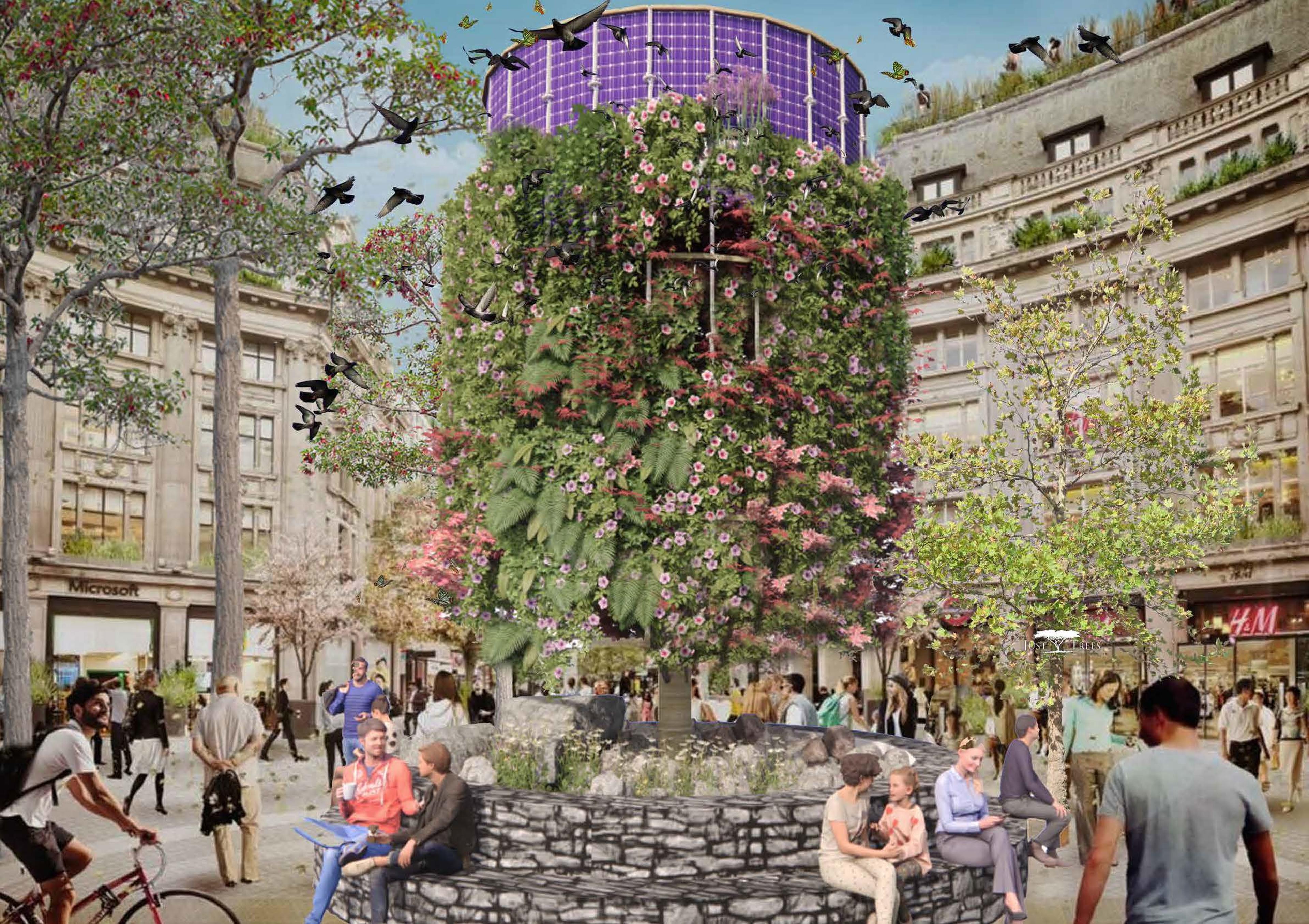 The base of the structure is a biophilic design, a circular bench made of natural stone for people to sit and enjoy this space and nature within, internally it filled with stones to collect and store rainwater, using it to feed the plants as well as the life it contains.