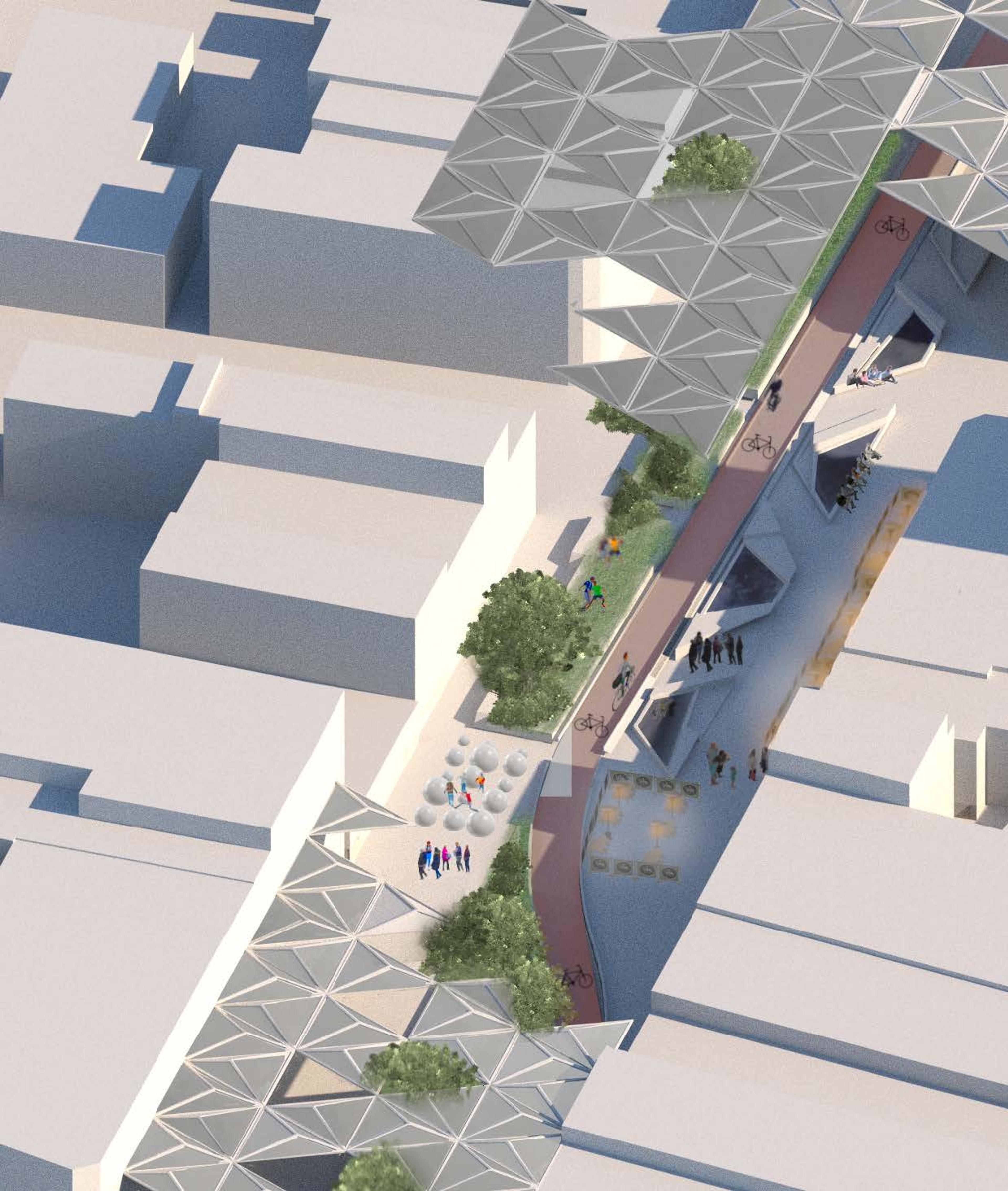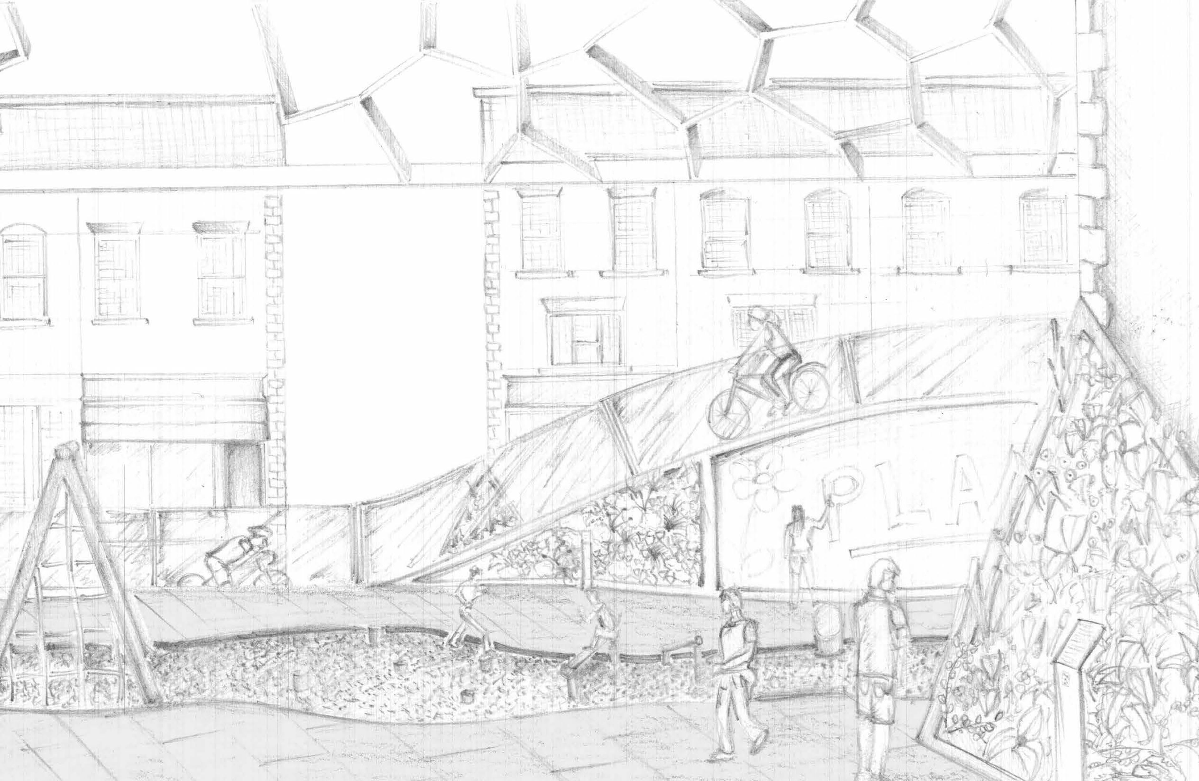 The user whether they choose to cycle/scoot/walk/run can choose their selected path which snakes and perforates through the landscape weaving between one another whilst still addressing safety measures. The design addresses the multitude of public issues that are eradicated along the route with areas of exhibition and break out spaces which encourage the users to learn, engage and play whilst being intergenerational. Cyclists are invited to enjoy the journeys with the inclusion of optional ramps, dips and turns not only for a playful engagement but helping to hone in on those all-important bike handling skills.