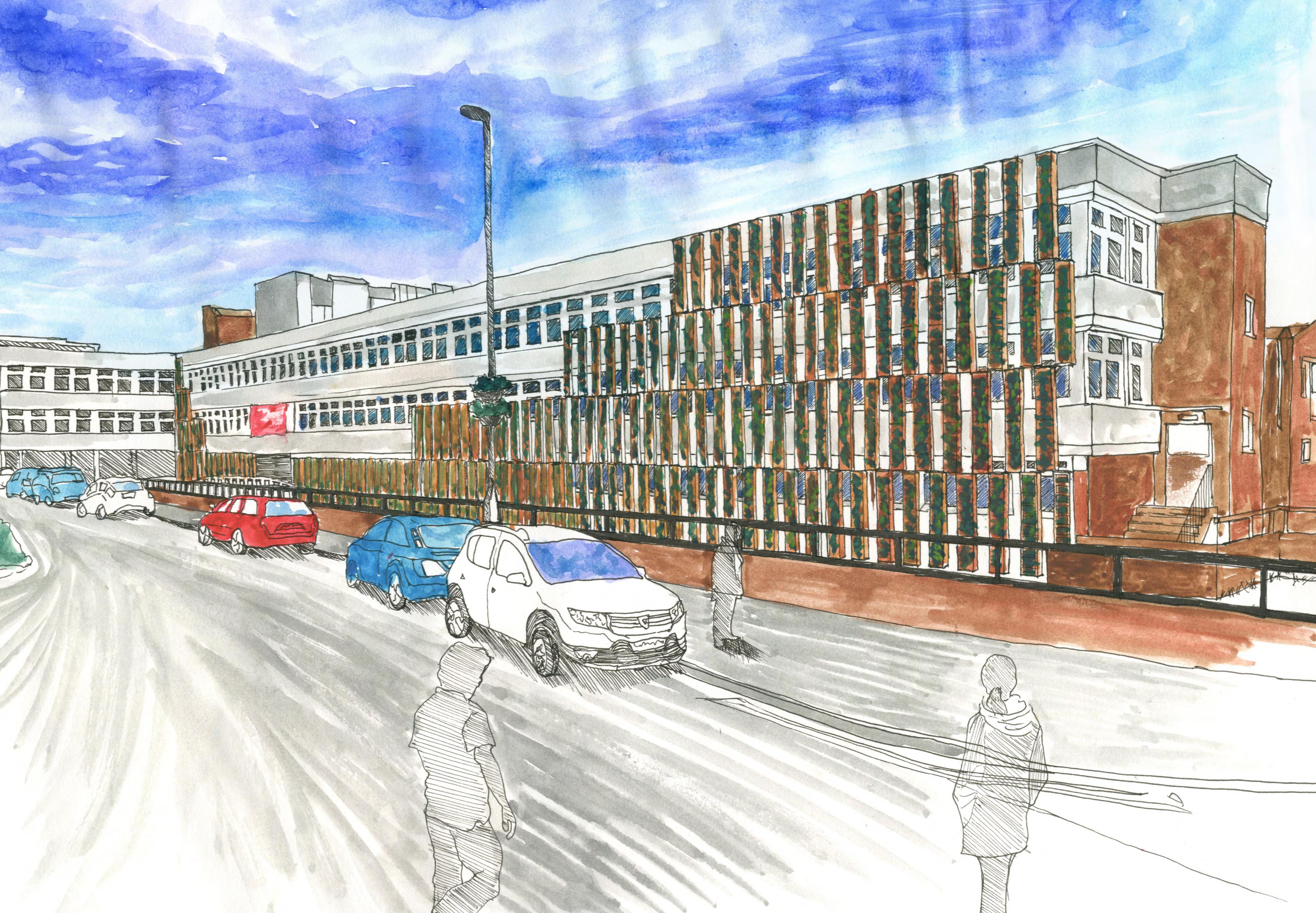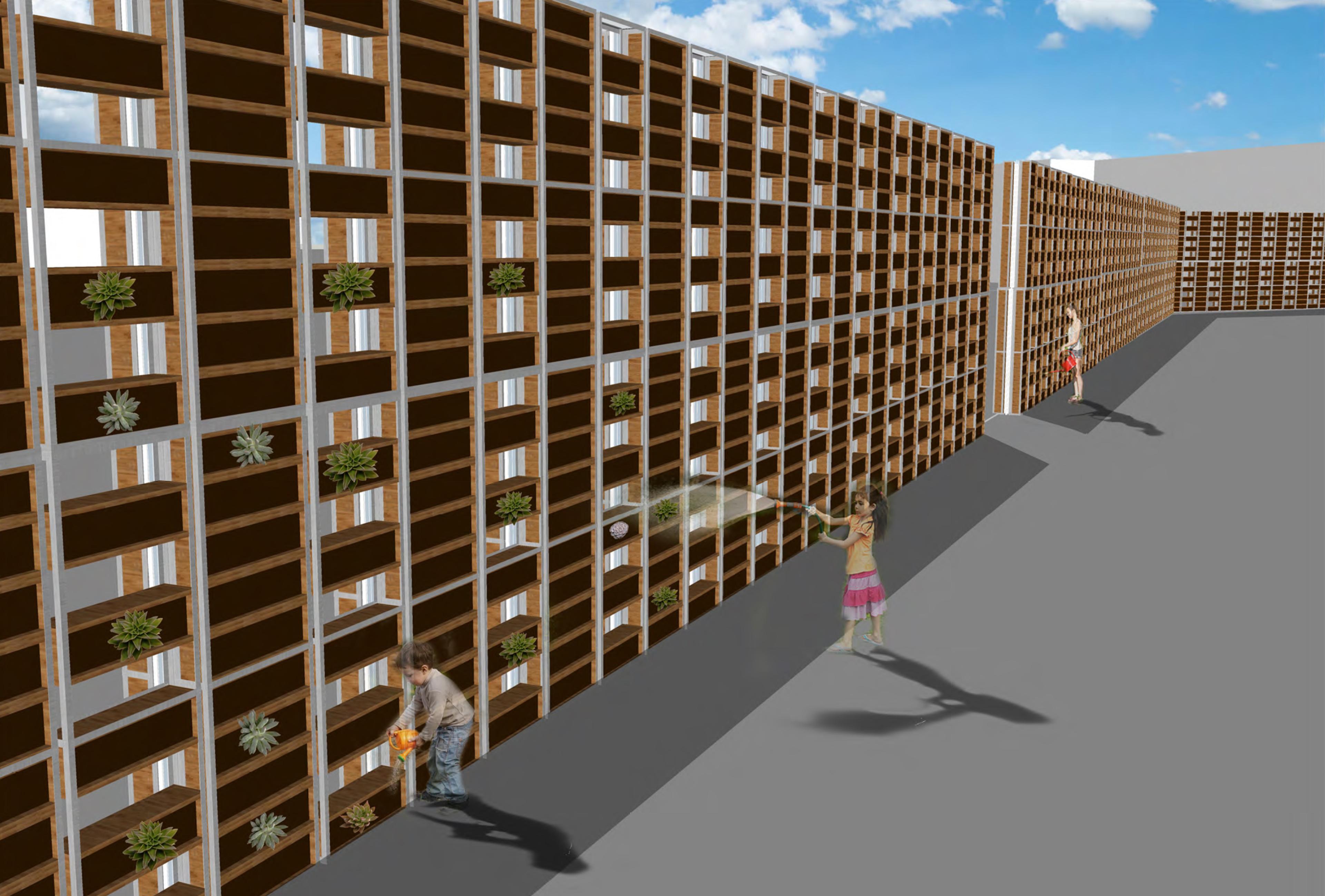This proposal is based on the idea that fixing core urban issues starts with ensuring people love the place they live and feel like it belongs to them. It proposes a programme for living walls that would give local residents a beautiful green vista to enjoy and even nurture themselves. The walls take the form of plywood boards, made from recycled materials, slotted into metal frames attached to building facades. These could be filled with a variety of low-growing succulents that require little care to flourish.